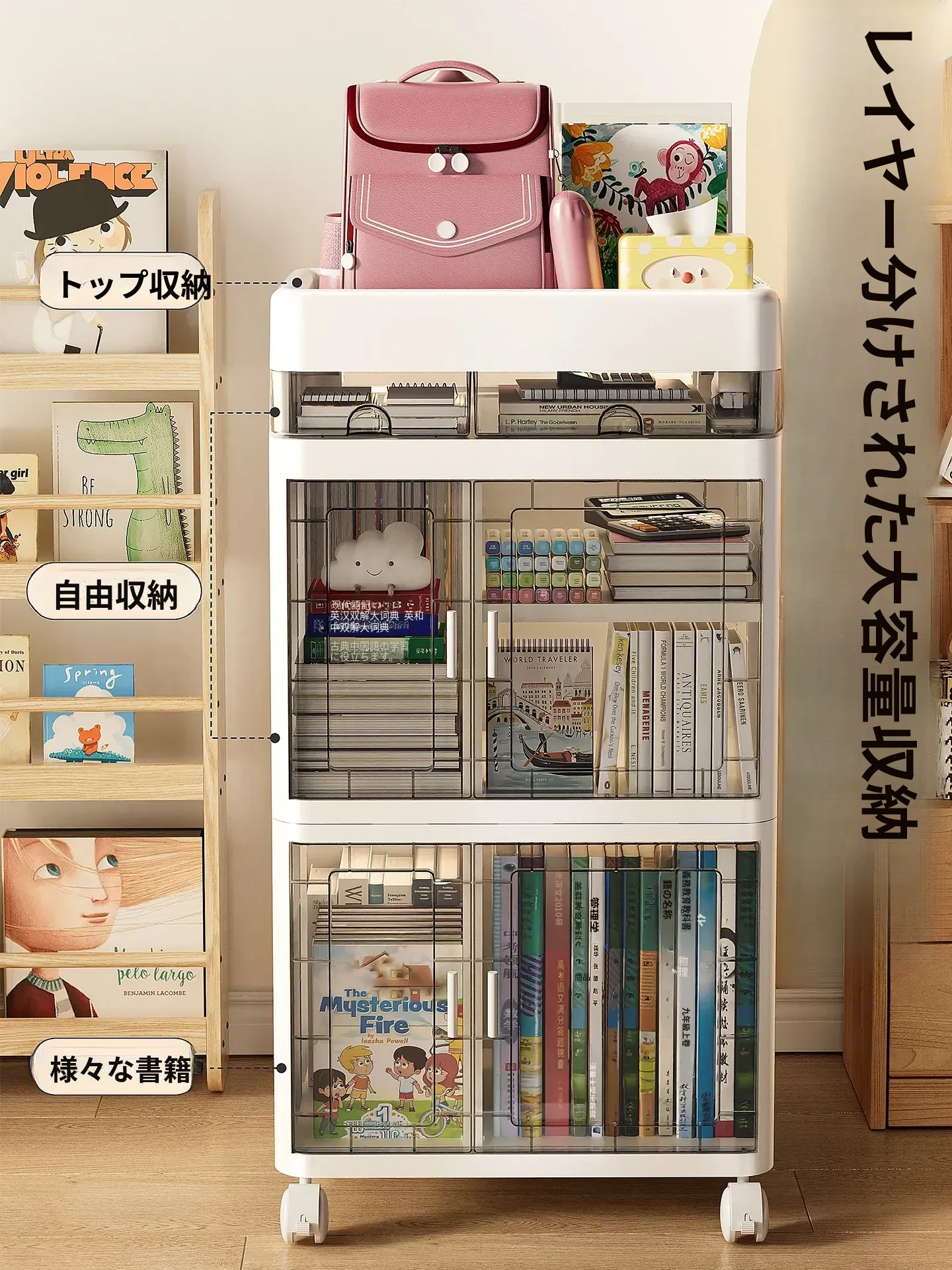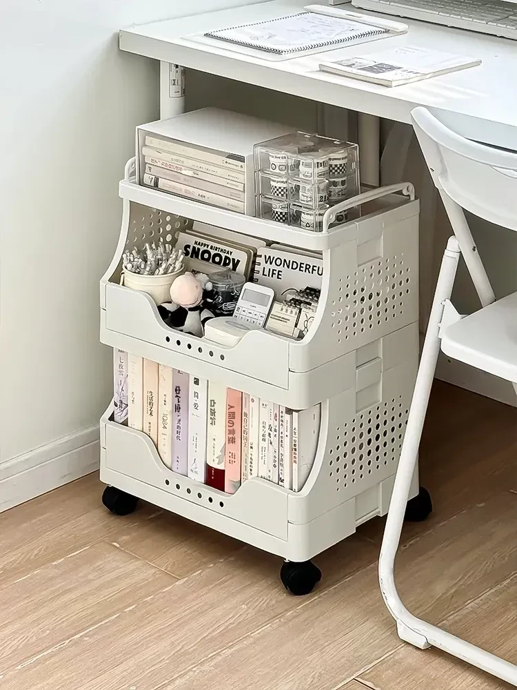 子供用書籍や文房具の整理に最適!多層型の防塵移動式収納ラック - デスク下にもピッタリ!おしゃれで機能的なブックスタンドで、お部屋をスッキリ整頓!