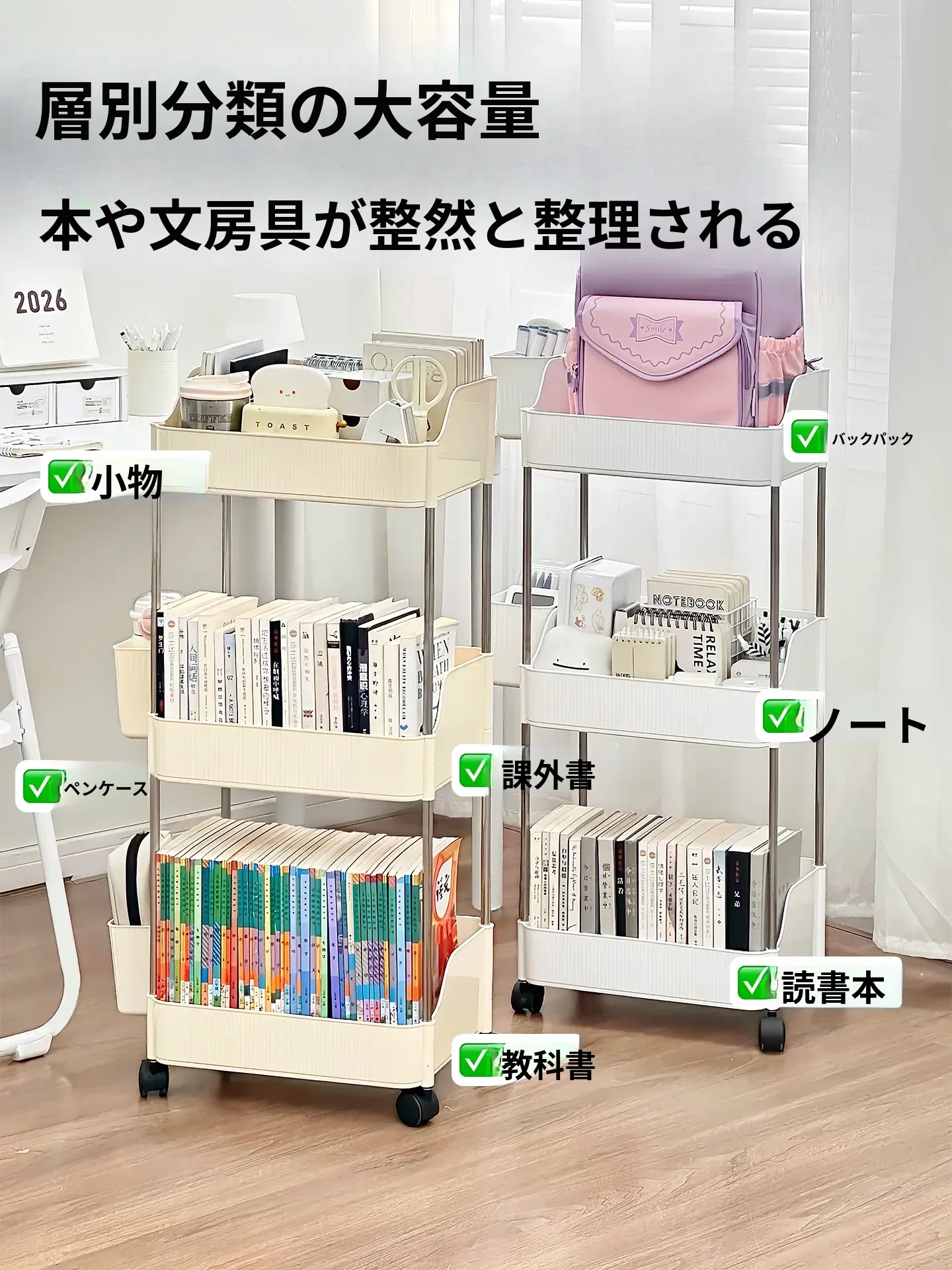 多機能収納ラック|学生のための落地式多層整理棚|書籍や文房具、玩具もスッキリ収納!おしゃれな小型カートで、寮生活をもっと便利に!