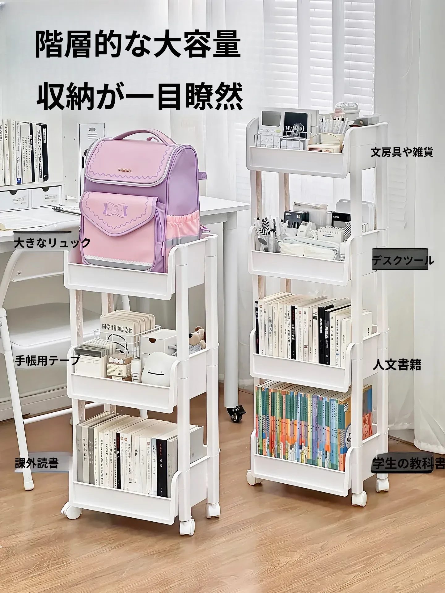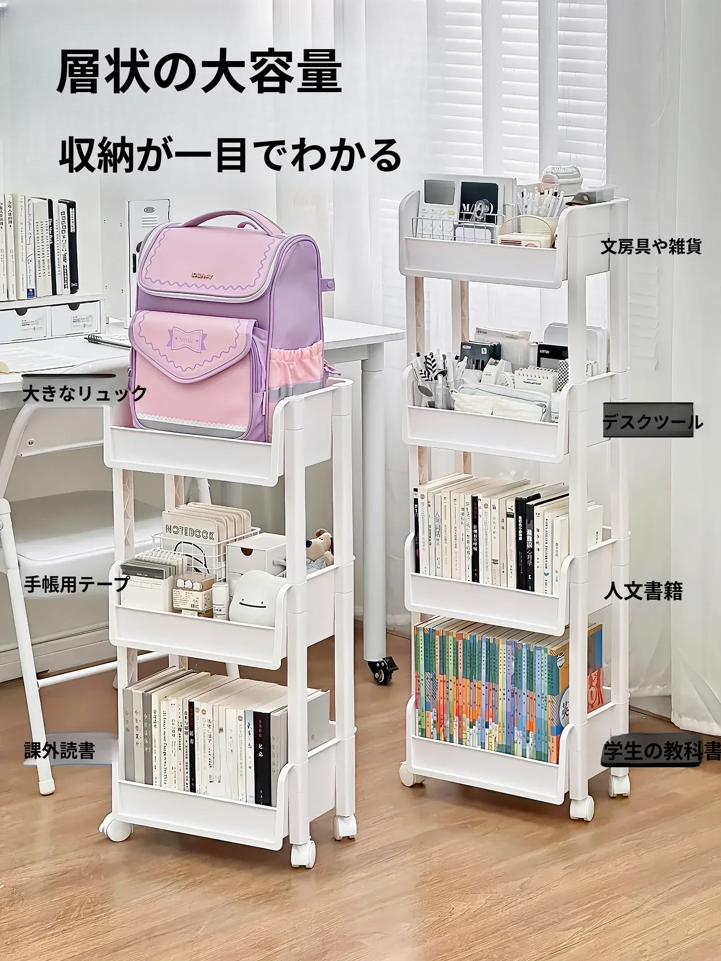 家庭用のスタンディングブックシェルフ|学生向けのバッグ収納|文具や書籍を整理するための多層式収納ラック|便利な移動式カートでお部屋をスッキリ整頓!