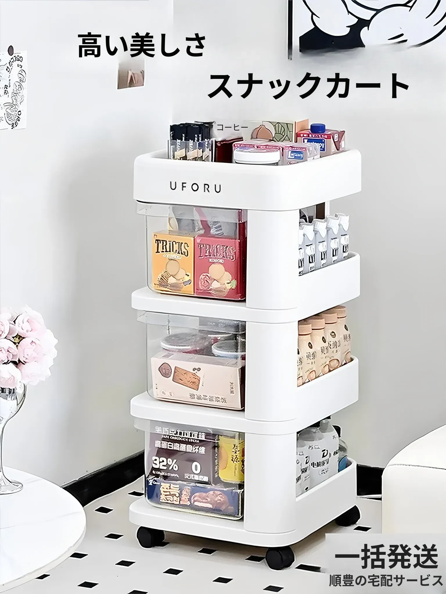おしゃれな多層収納ラック!リビングや寝室にぴったりな移動式スナック収納カート。高品質でスタイリッシュ、すっきりとした整理整頓を実現します!