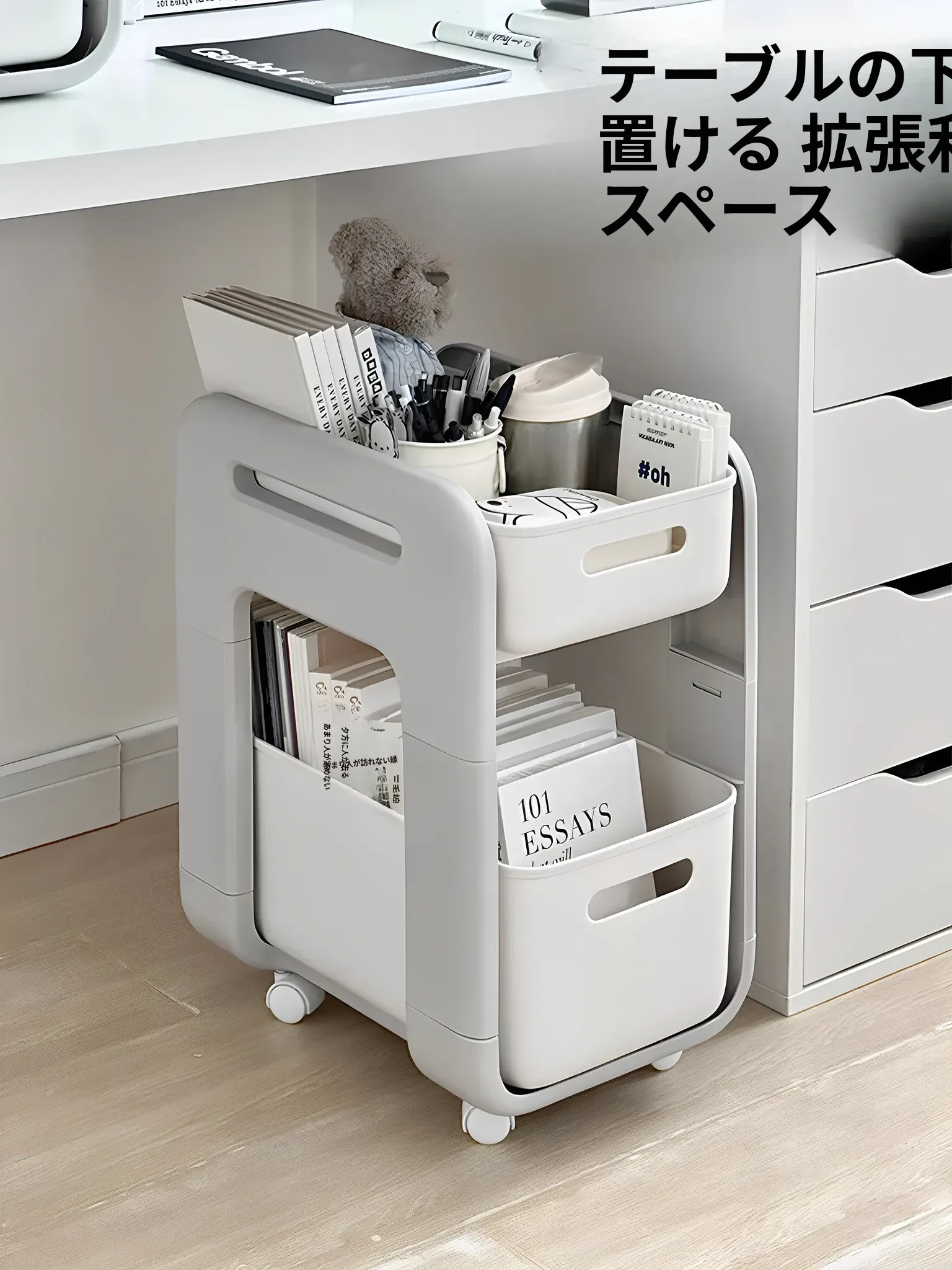 多機能デスクサイド収納ラック - 本や文具をすっきり整理!家庭用デスク下にぴったりの移動式キャスター付きラック。おしゃれで便利な収納ソリューションで、スペースを有効活用!