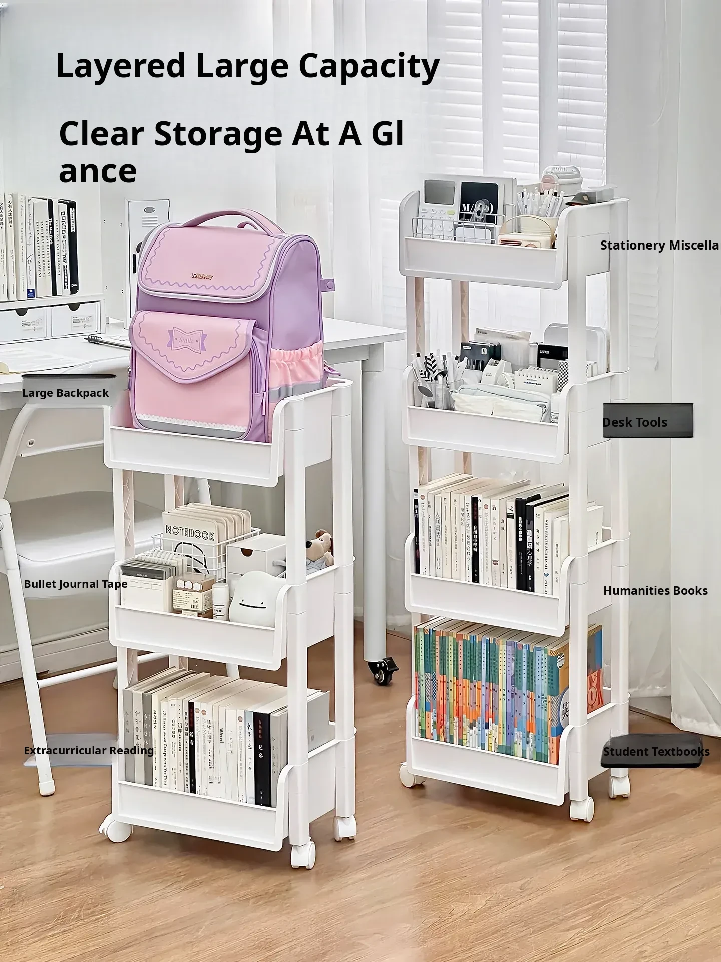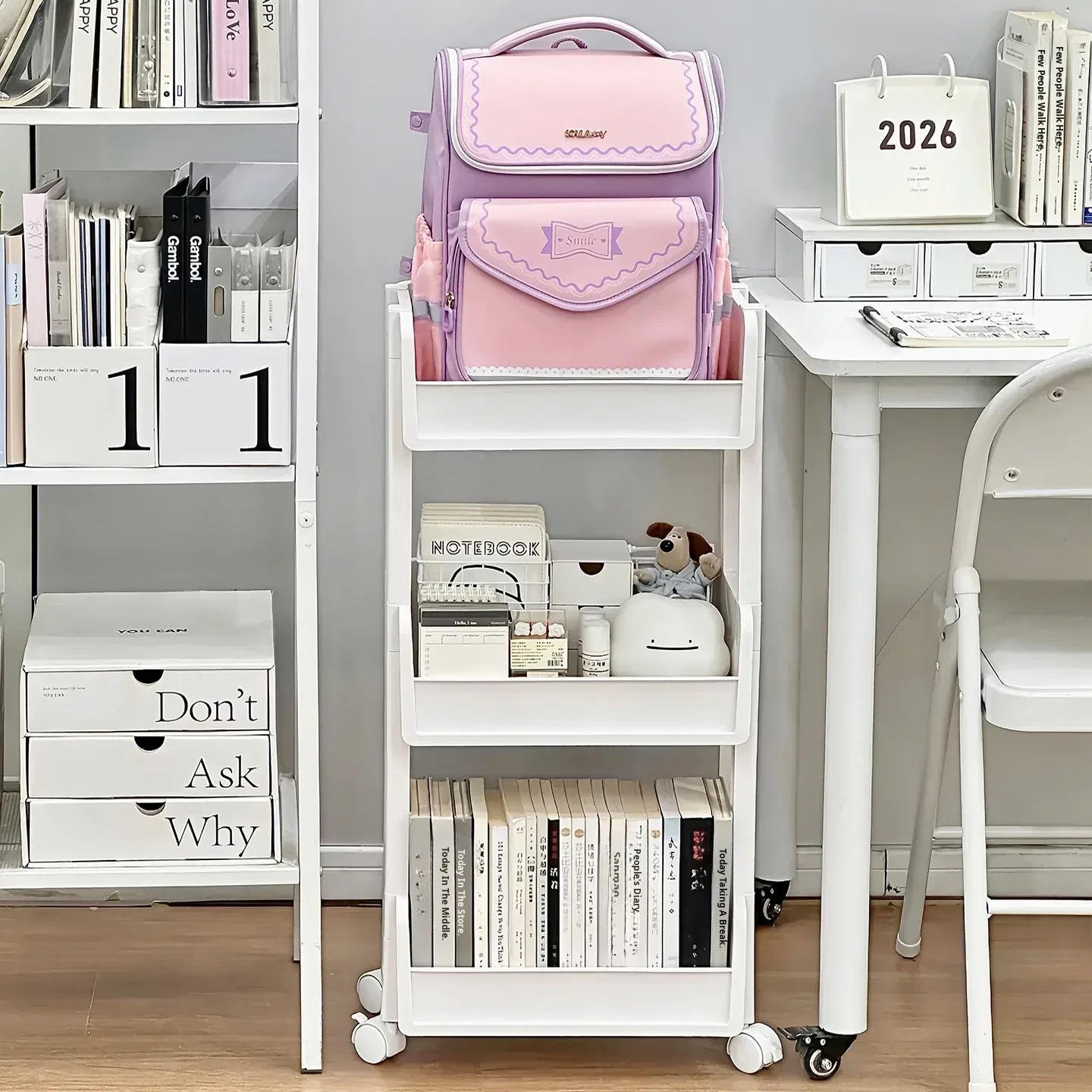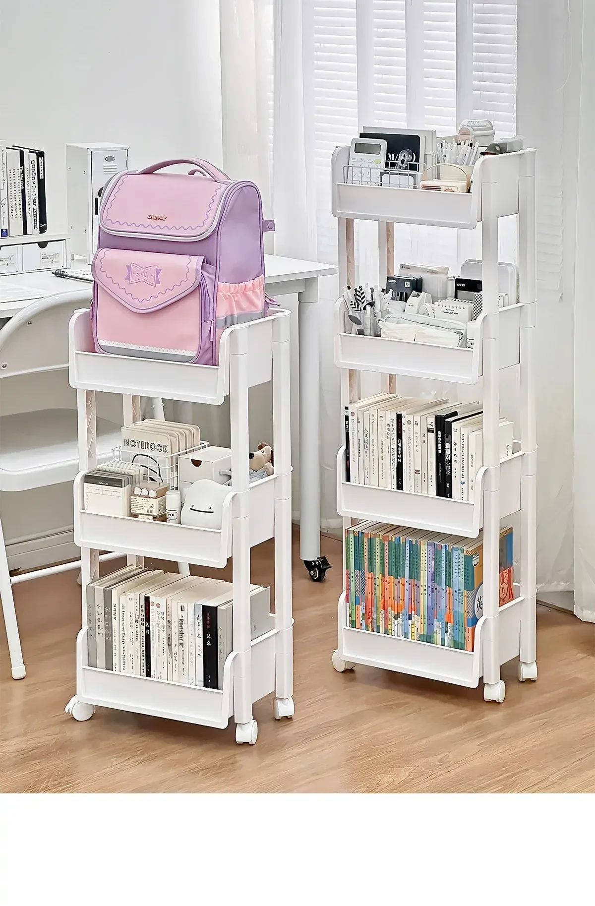 Multi-Tiered Moveable Bookshelf - Stylish Floor Storage Rack for Home, Perfect for Organizing Books, Student Backpacks, and Stationery Items. Ideal for Living Rooms, Offices, and Study Areas.