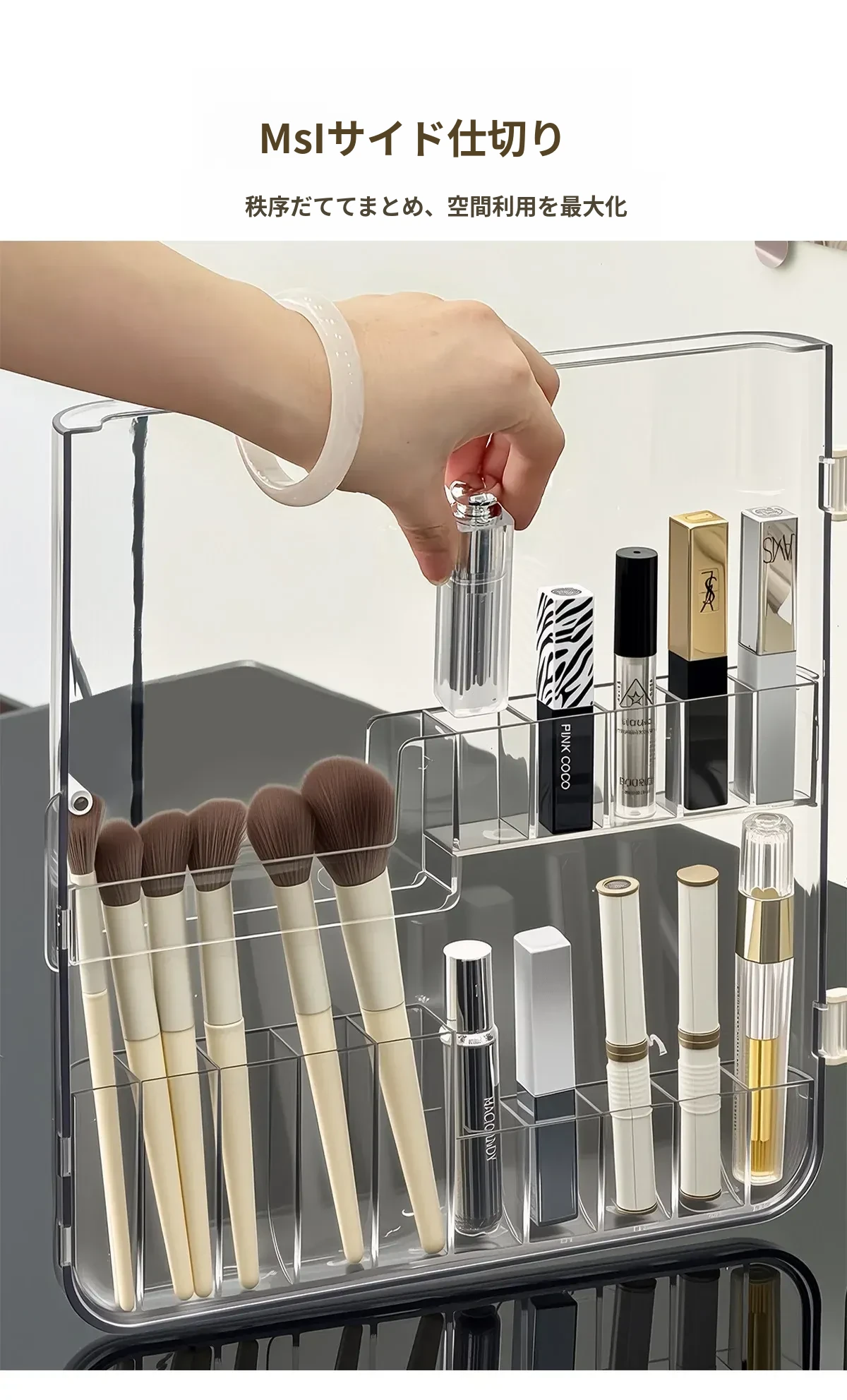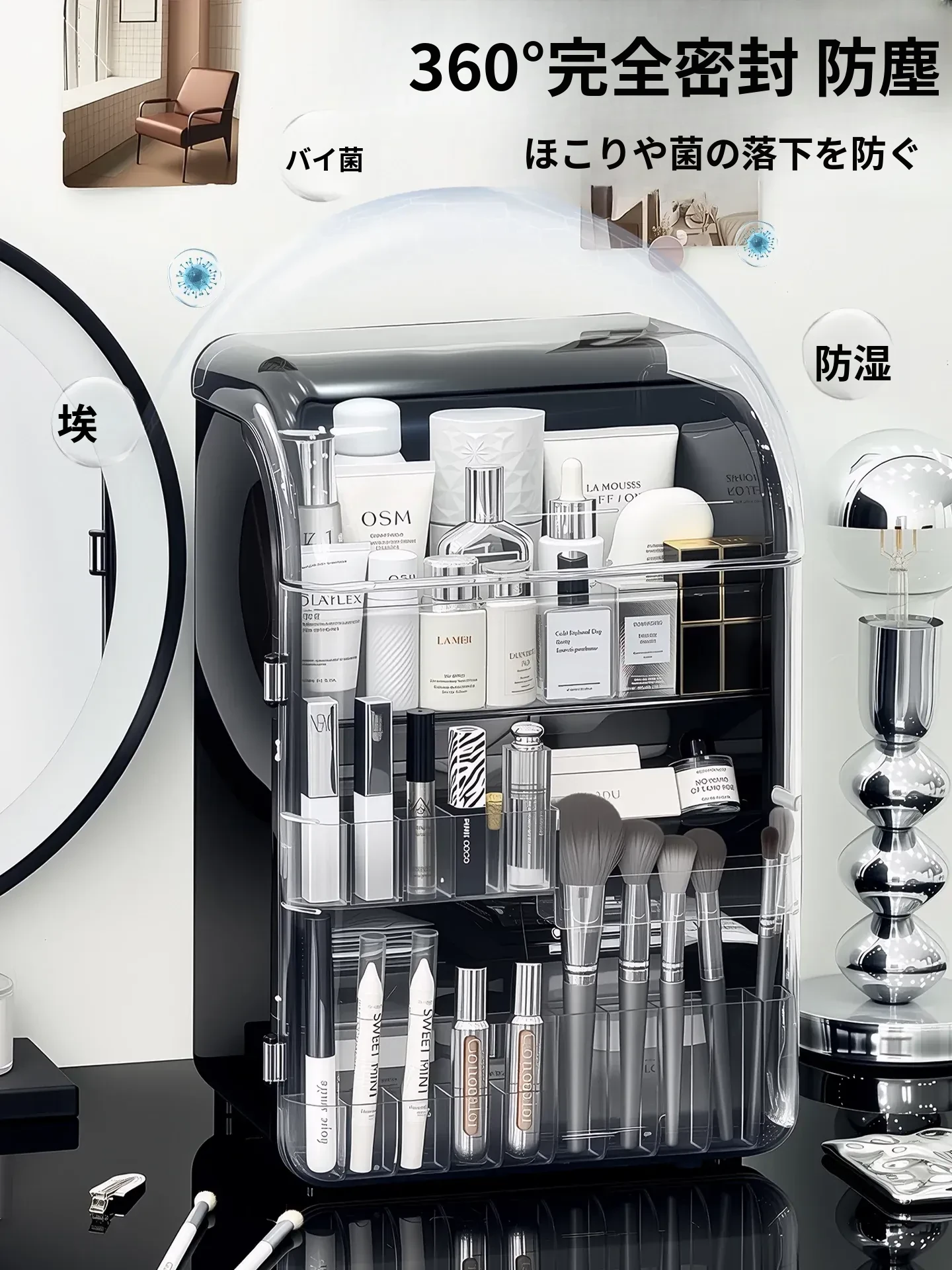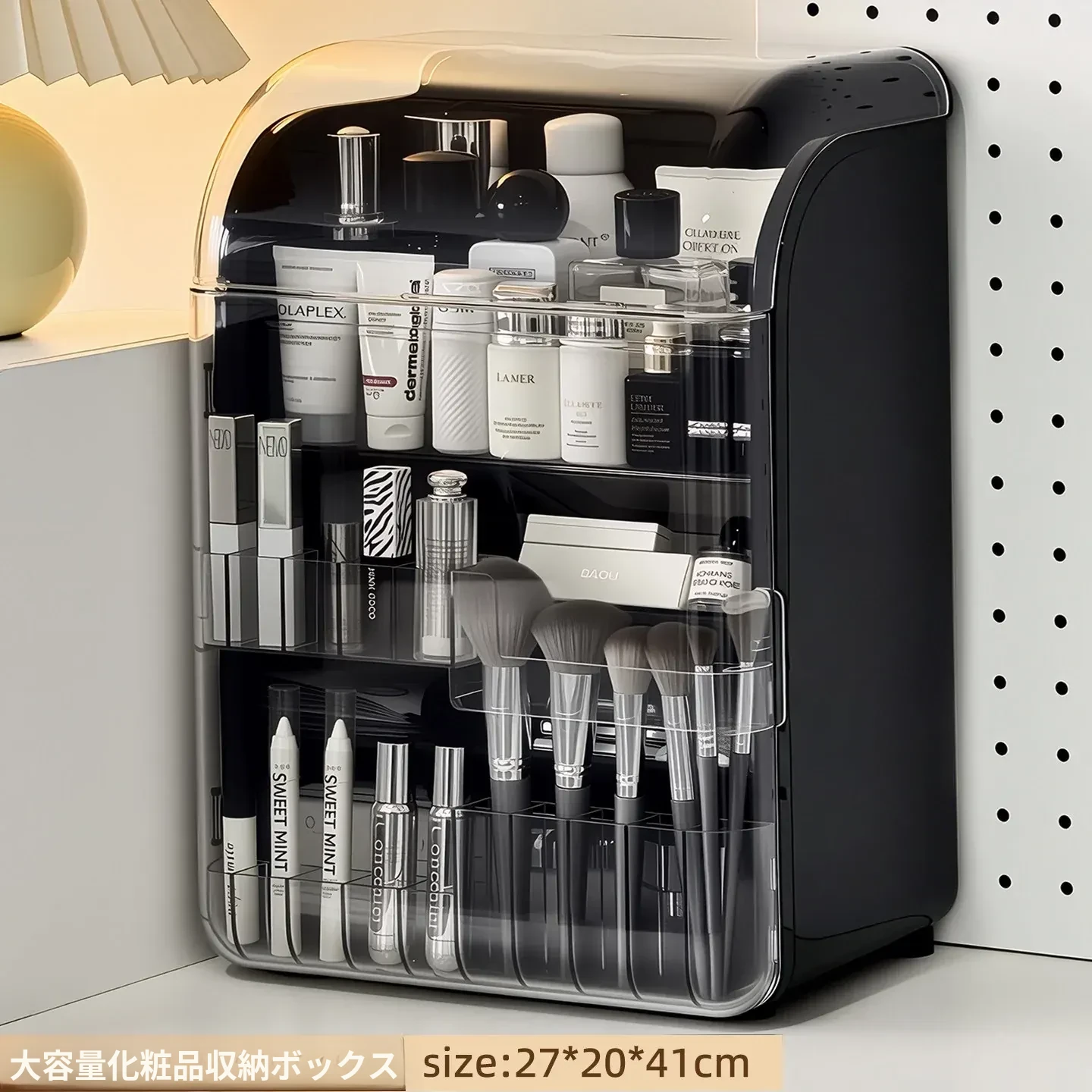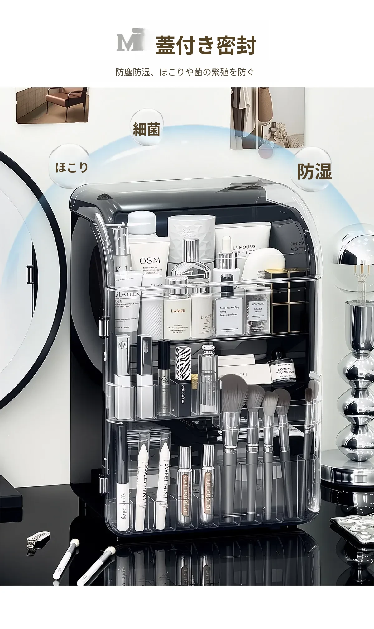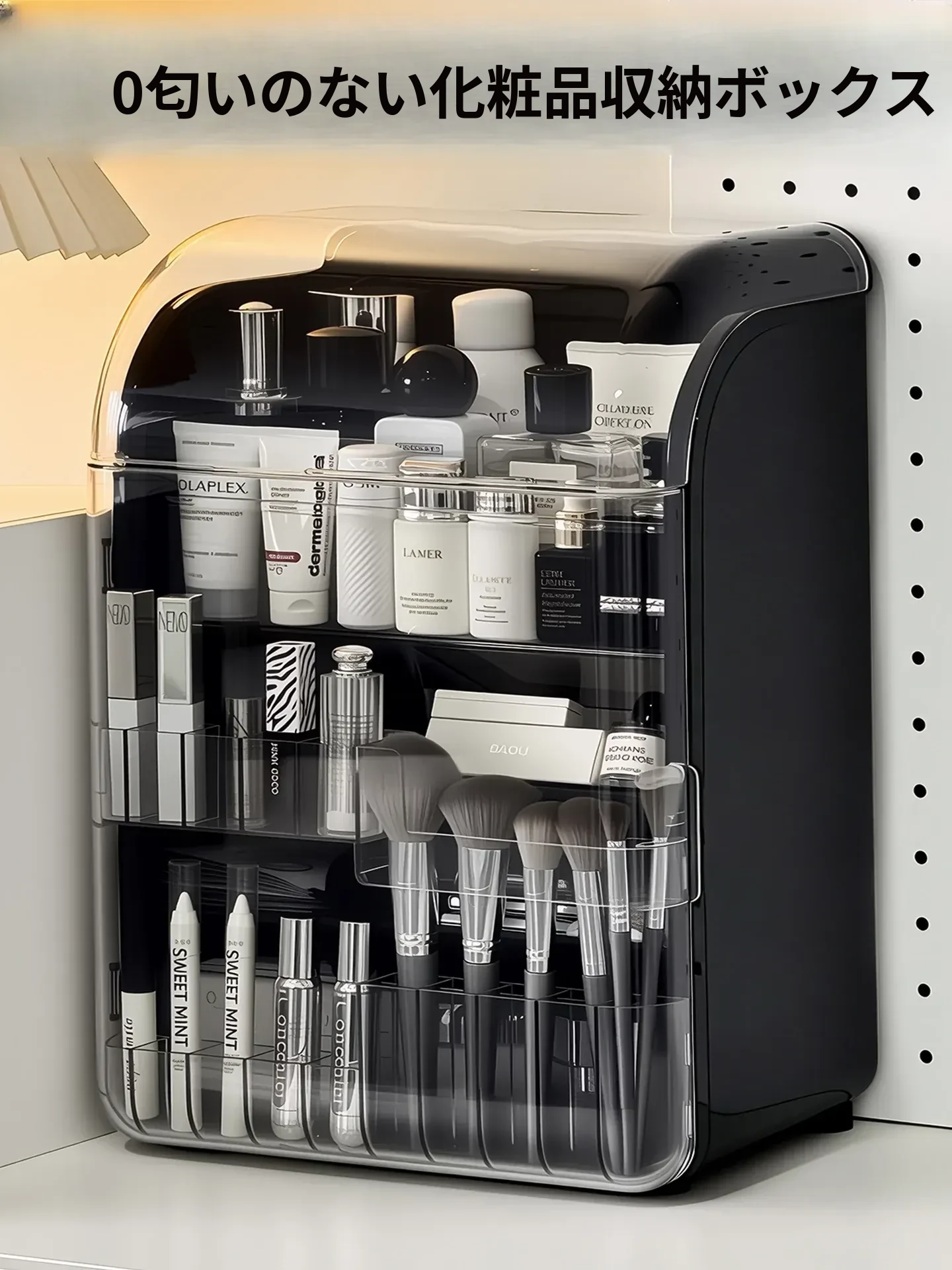透明で防塵効果抜群のメイクアップ収納ボックス!おしゃれなアクリル製で、化粧台をスッキリ整理。スキンケア製品や香水を美しくディスプレイし、毎日のメイクがもっと楽しくなる!