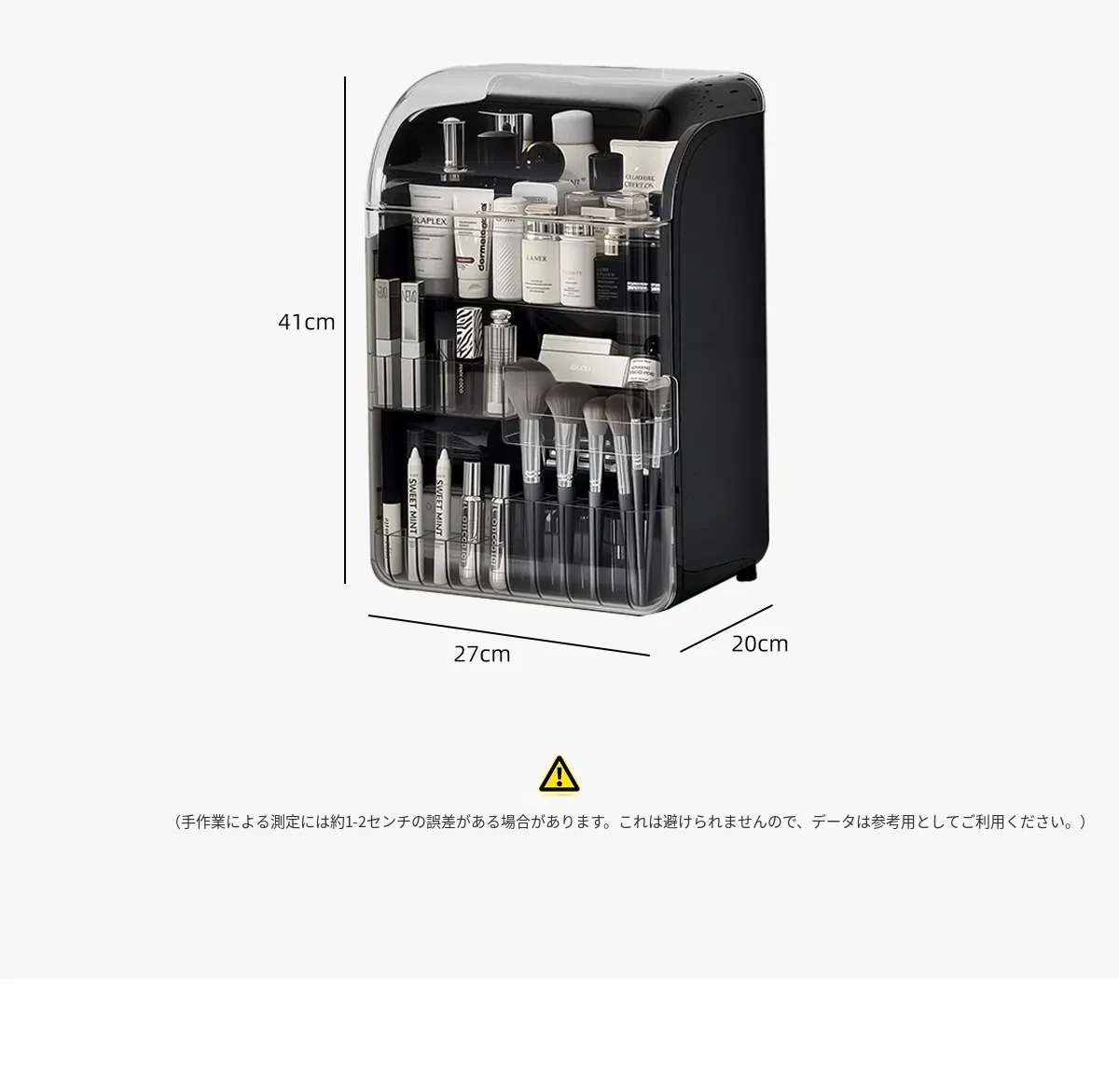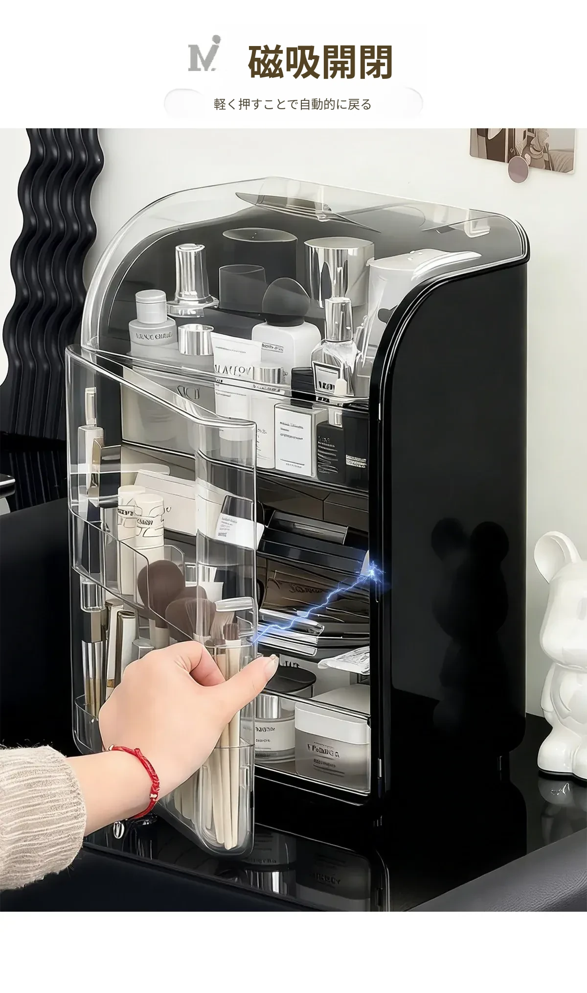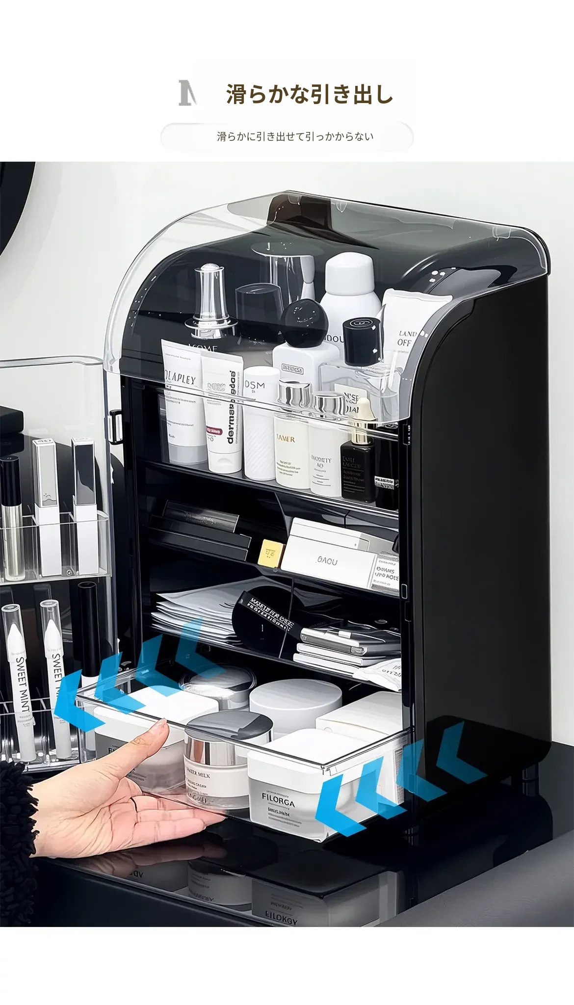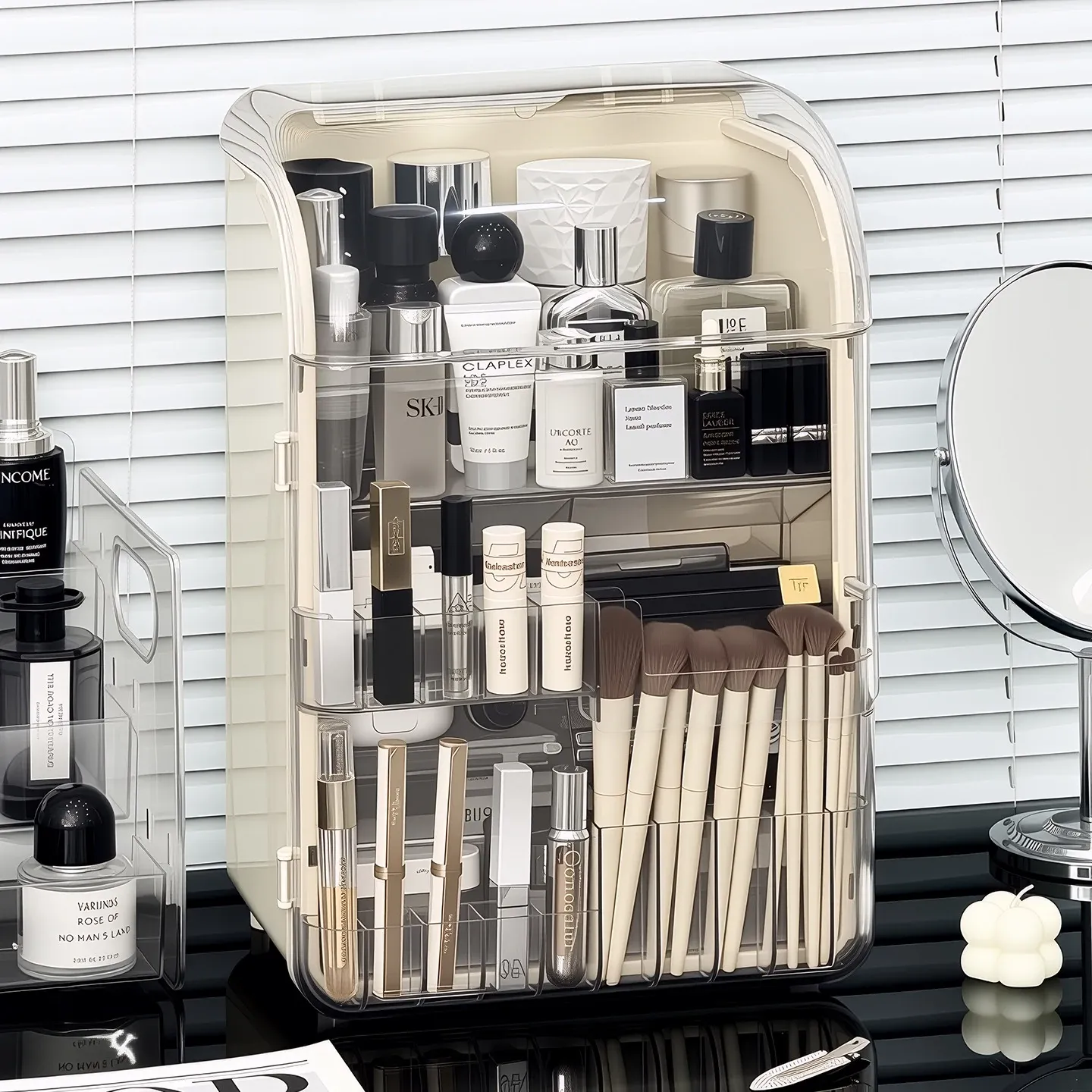 透明で防塵効果抜群のメイクアップ収納ボックス!おしゃれなアクリル製で、化粧台をスッキリ整理。スキンケア製品や香水を美しくディスプレイし、毎日のメイクがもっと楽しくなる!