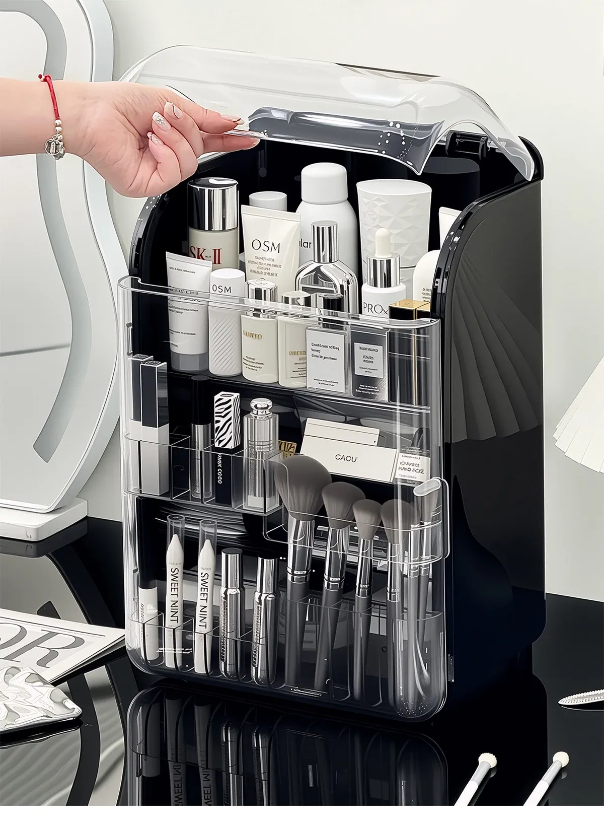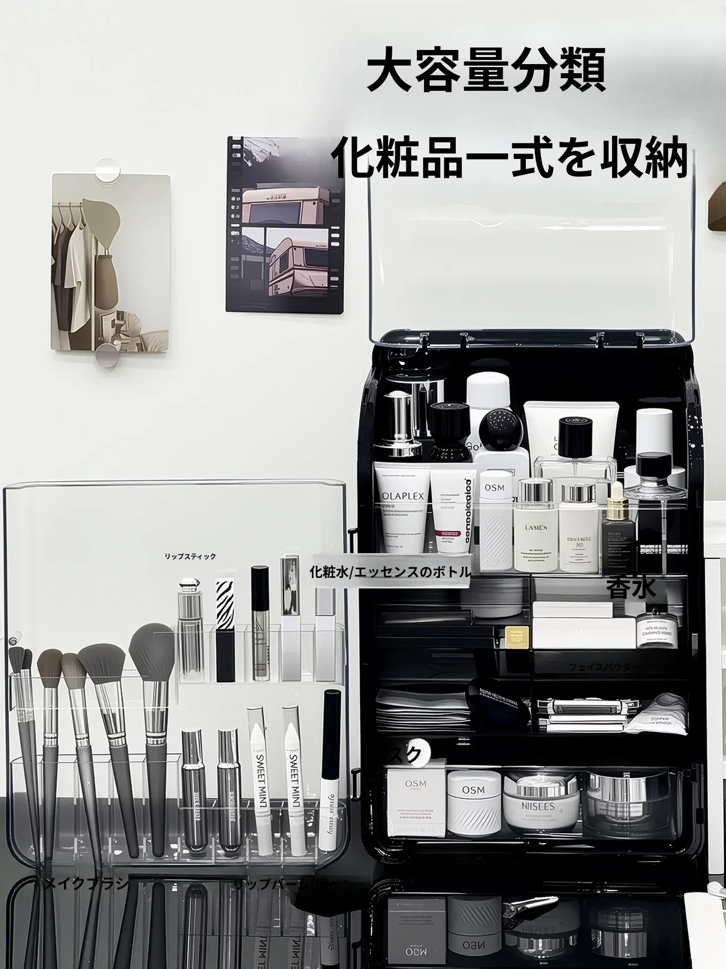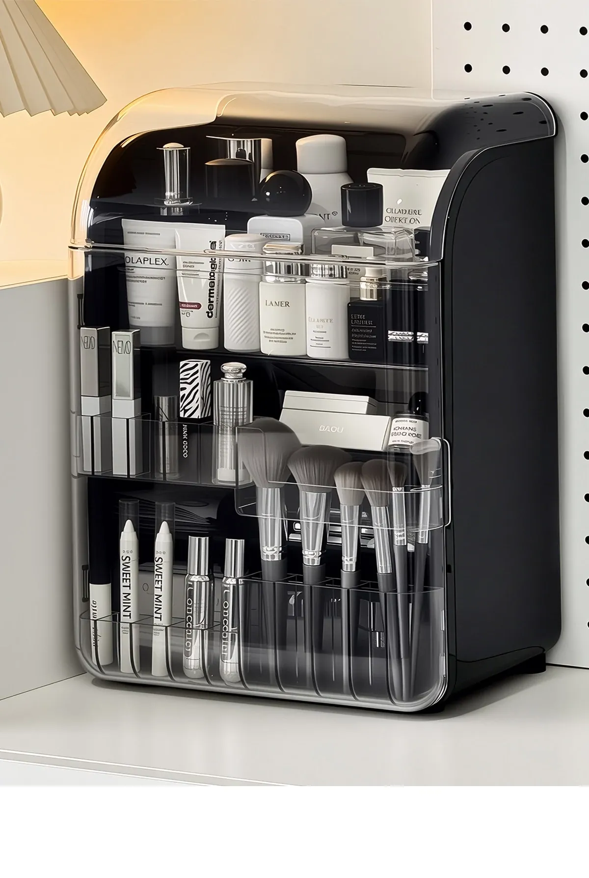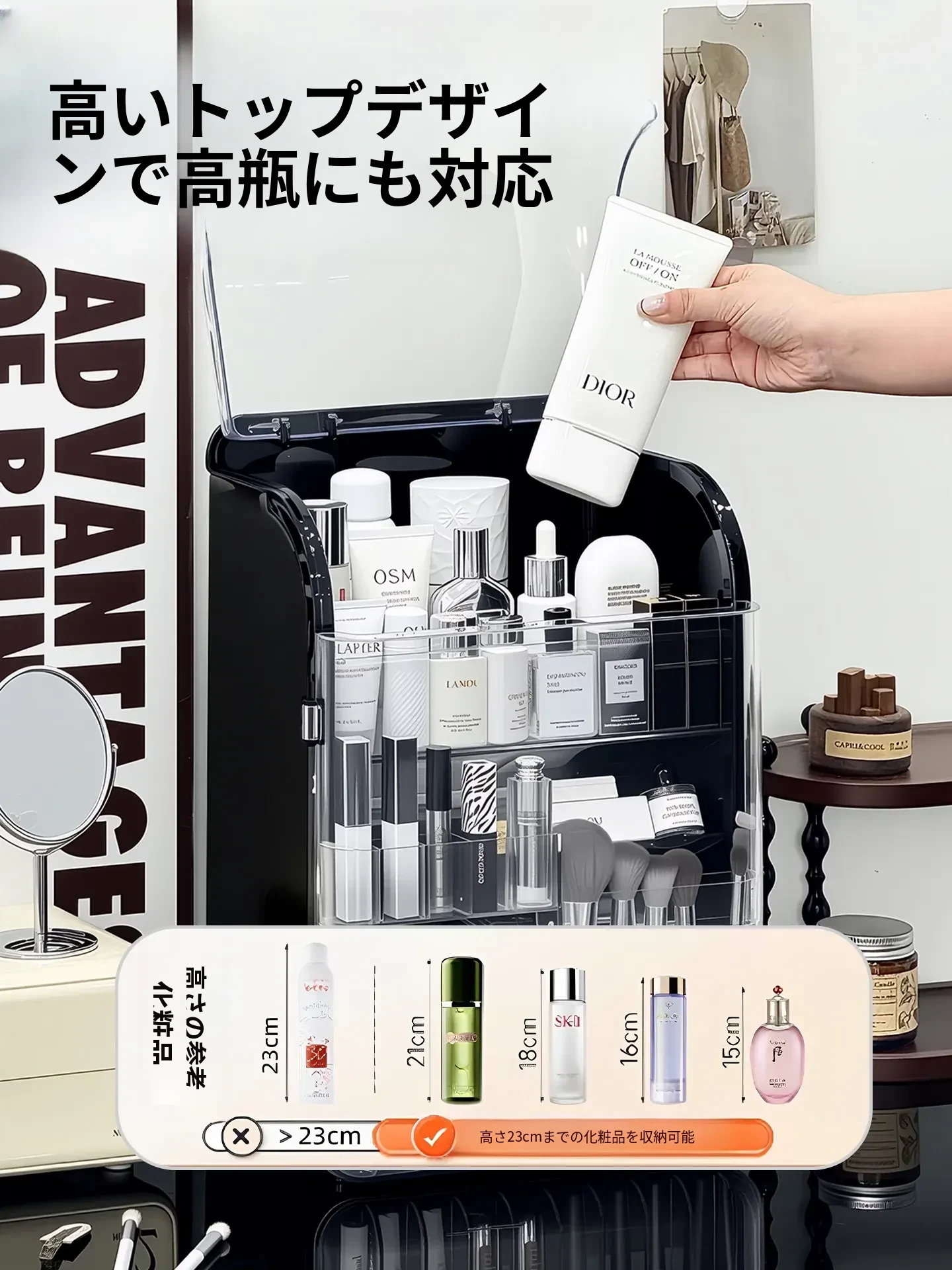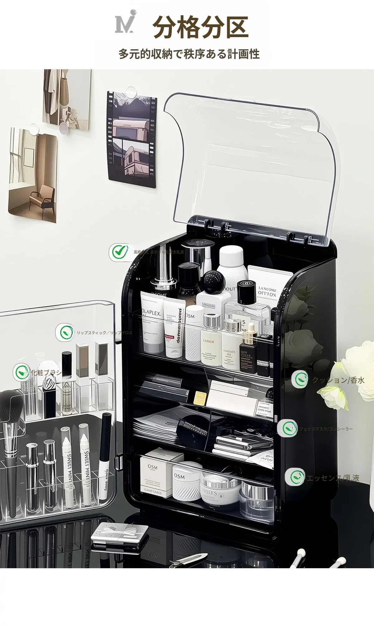 透明で防塵効果抜群のメイクアップ収納ボックス!おしゃれなアクリル製で、化粧台をスッキリ整理。スキンケア製品や香水を美しくディスプレイし、毎日のメイクがもっと楽しくなる!