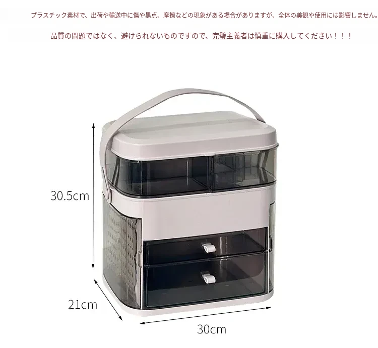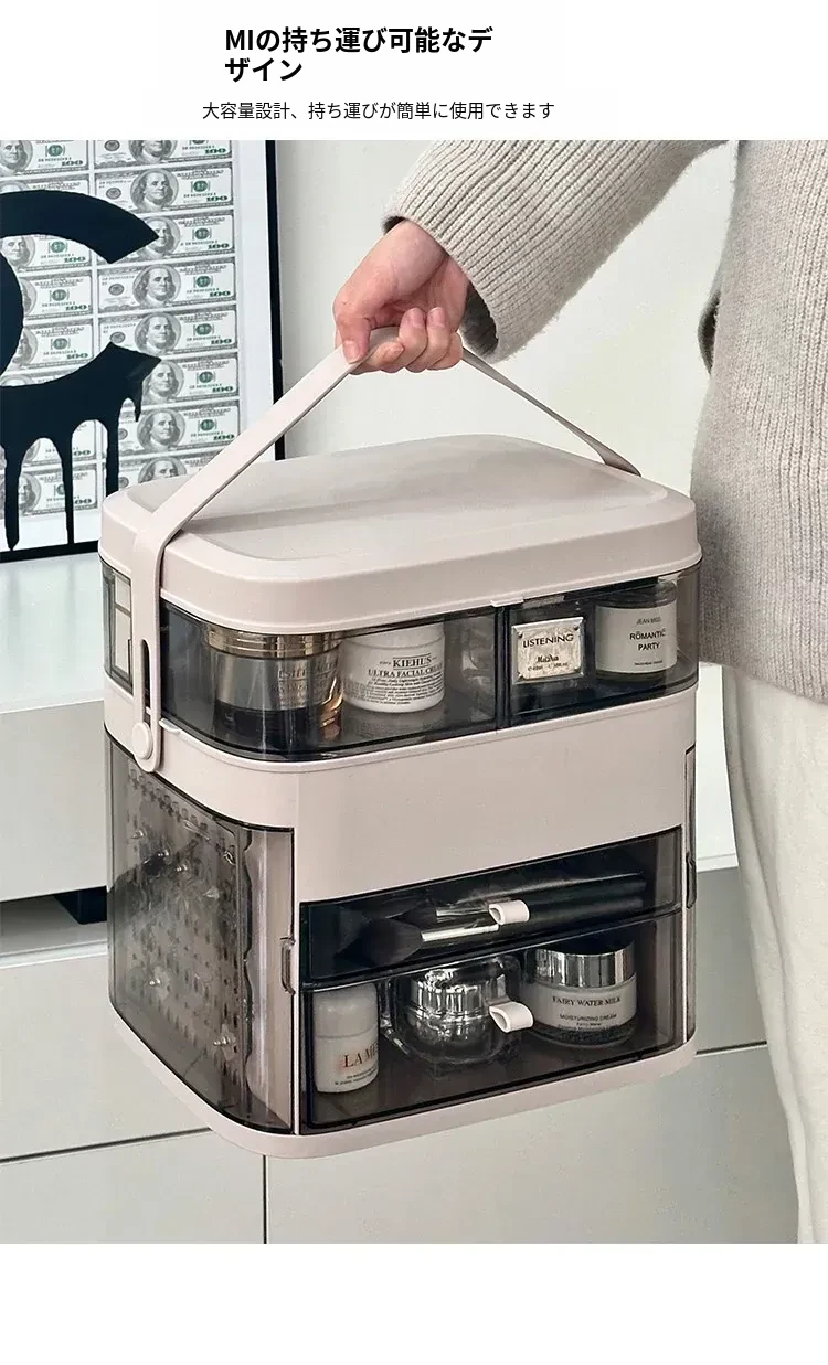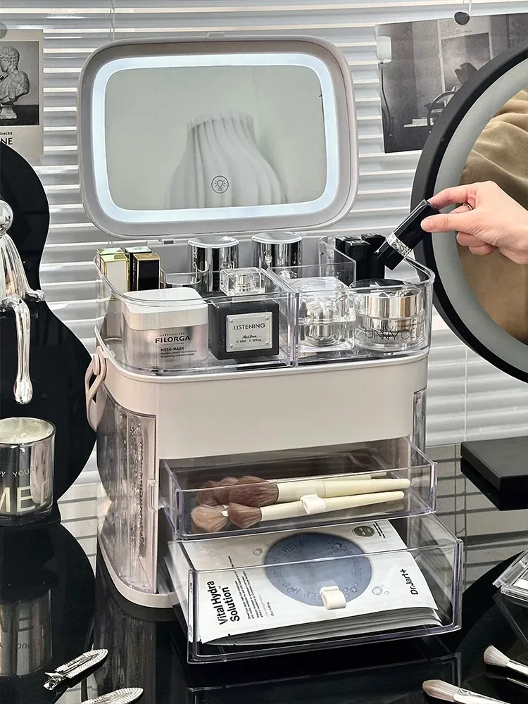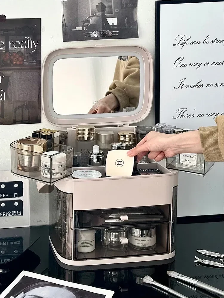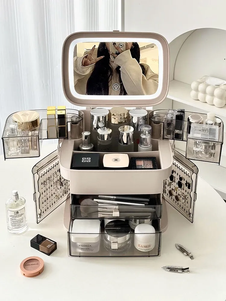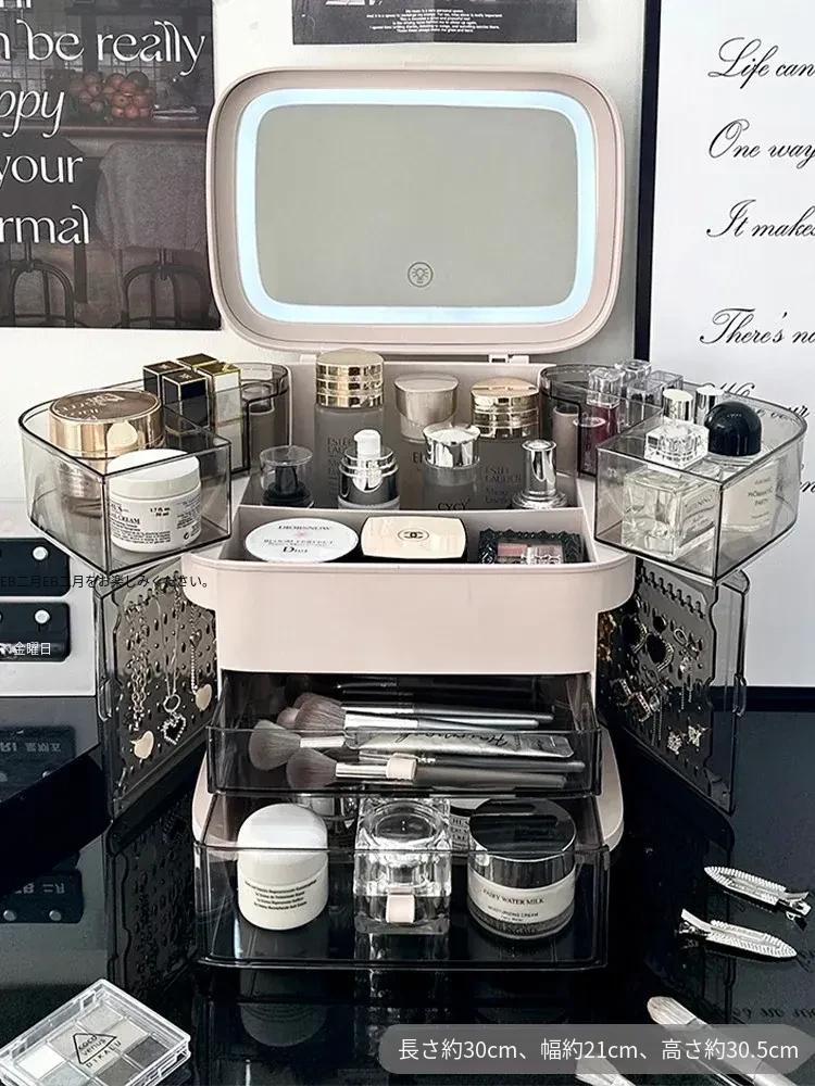 高級感溢れる化粧品収納ボックス!ライト付きミラー&防塵デザインで、スマートに整理整頓。大容量で、あなたのメイク道具をすっきり収納。卓上で華やかさアップ!