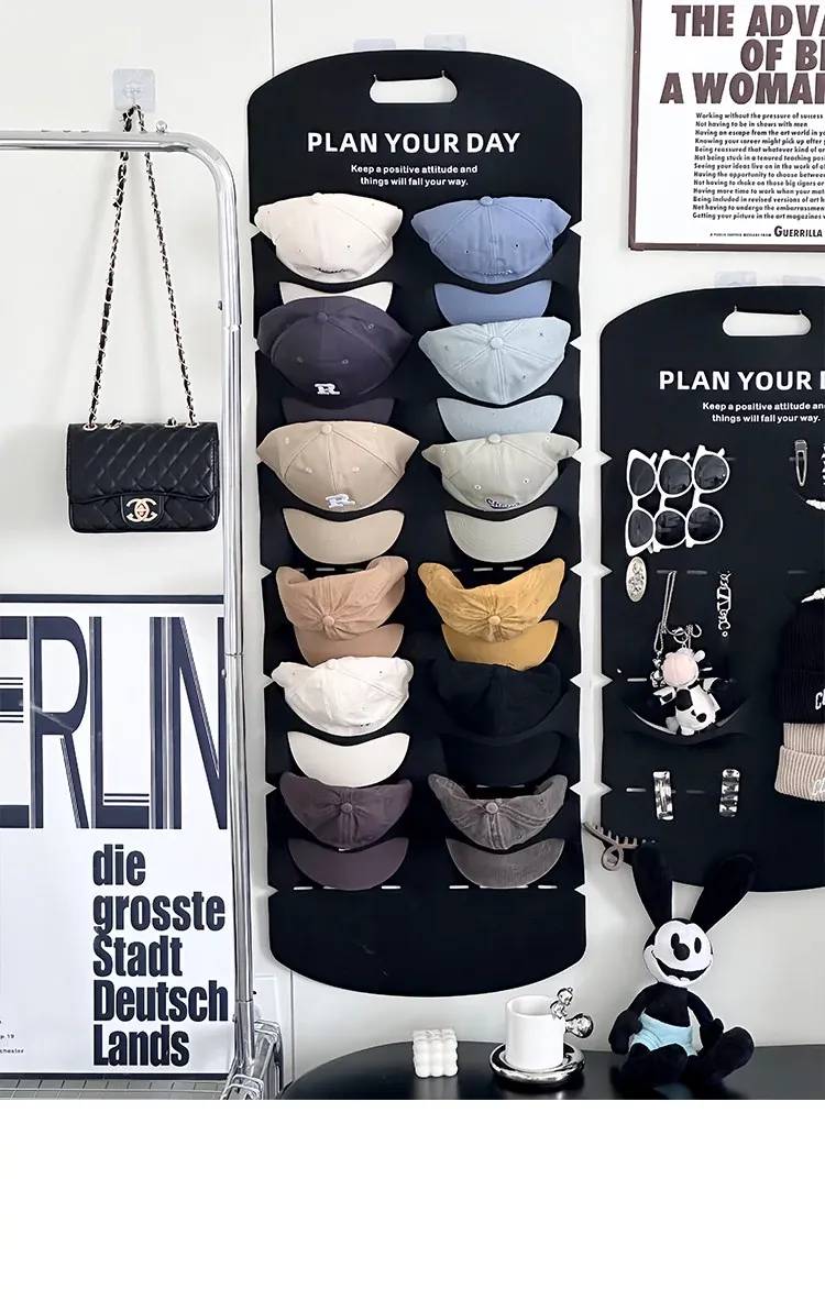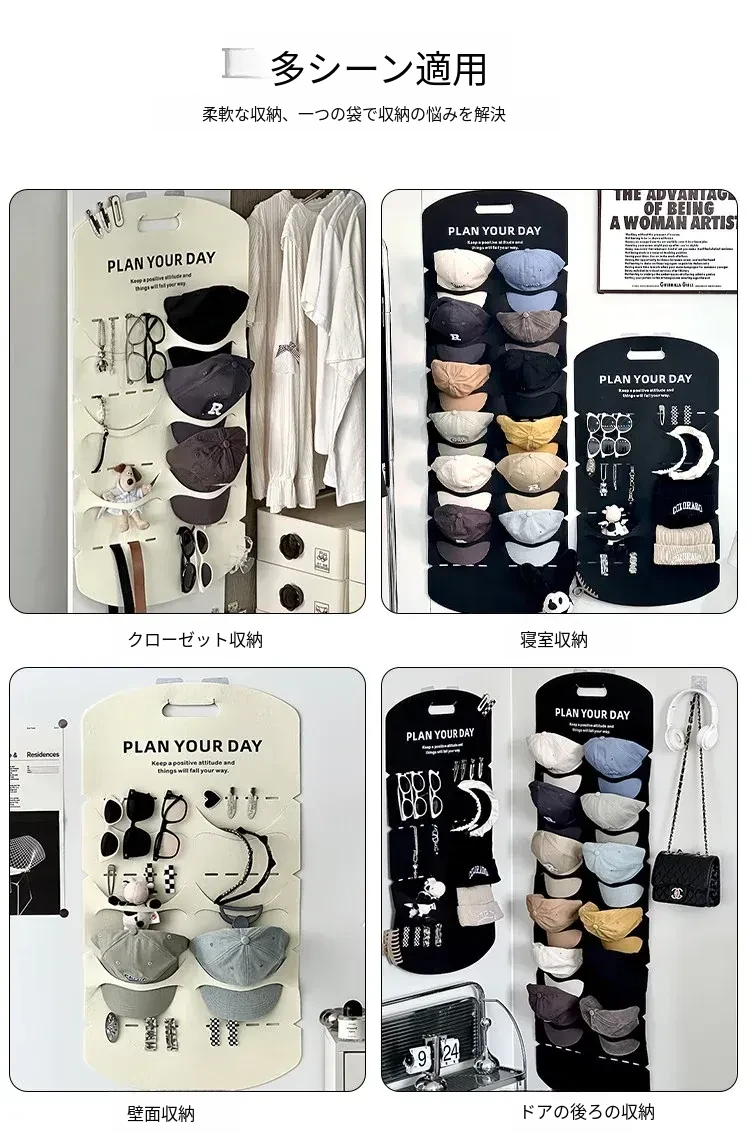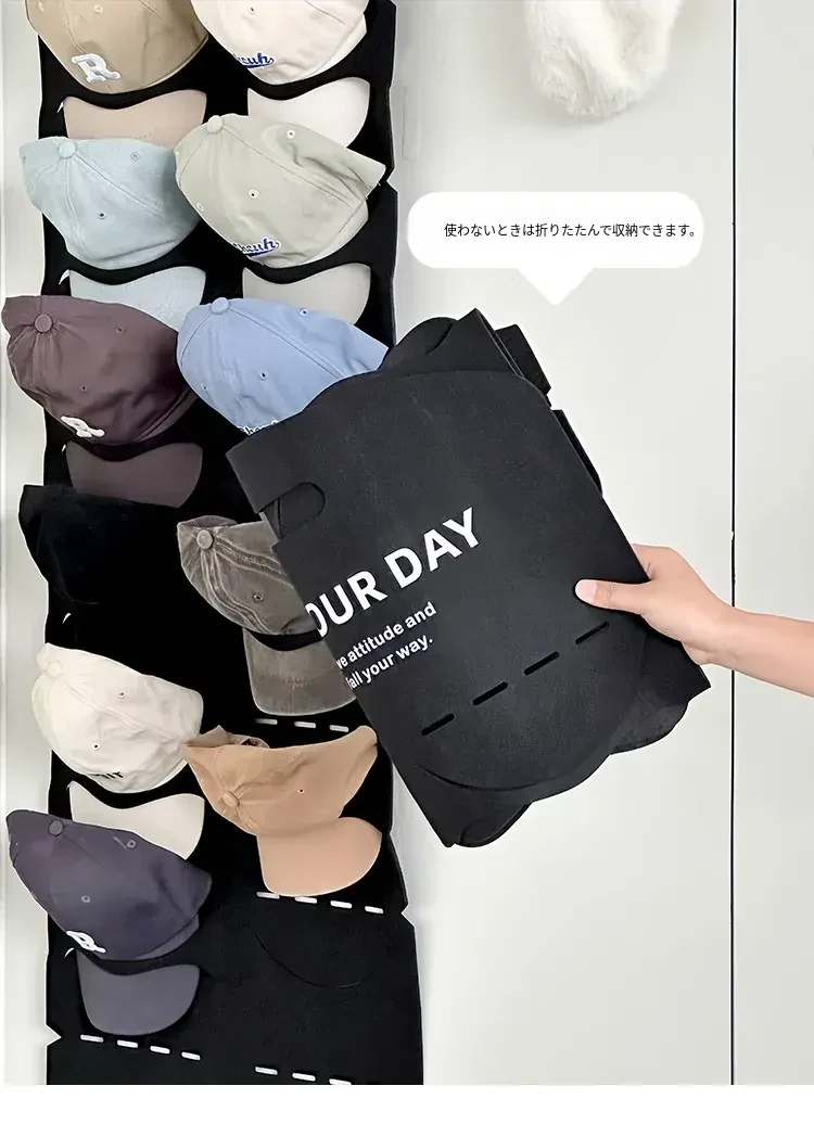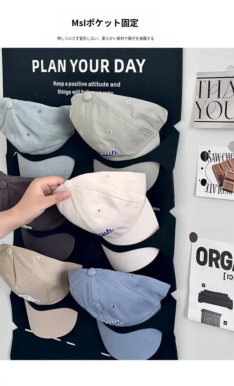 帽子収納の魔法!穴を開けずに使えるクローゼットドア裏の便利なキャップハンガー。ダックビルキャップや野球帽もすっきり整理!学生寮にも最適なフェルト製の帽子ラックで、収納スペースを有効活用!