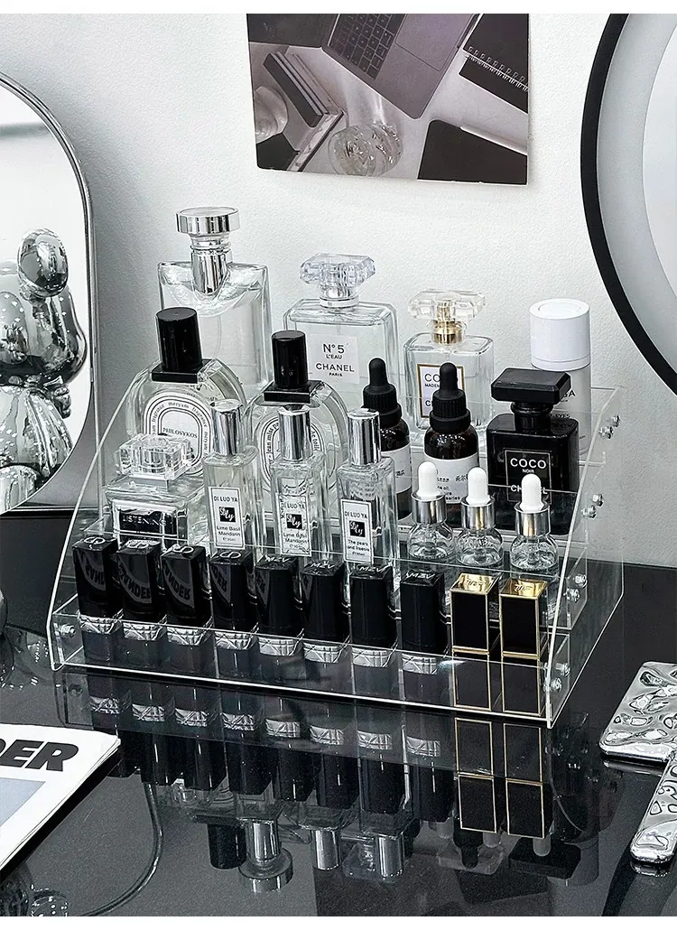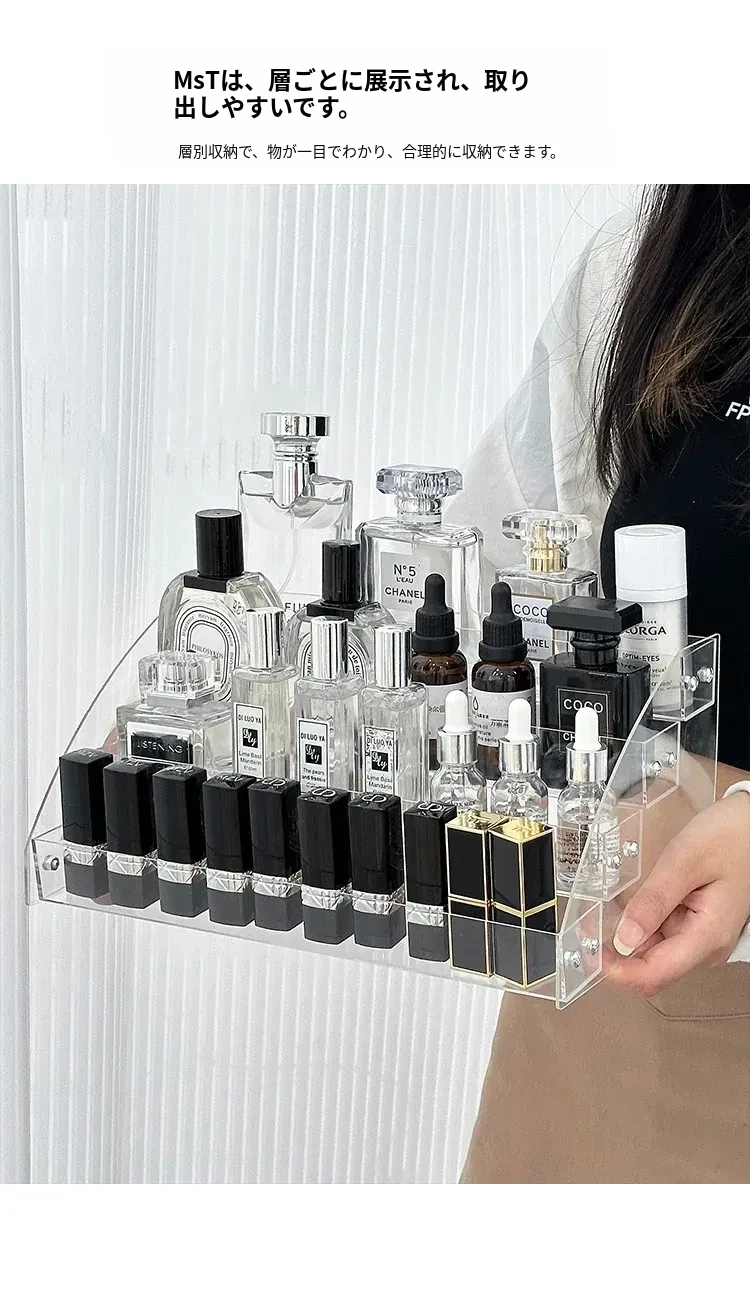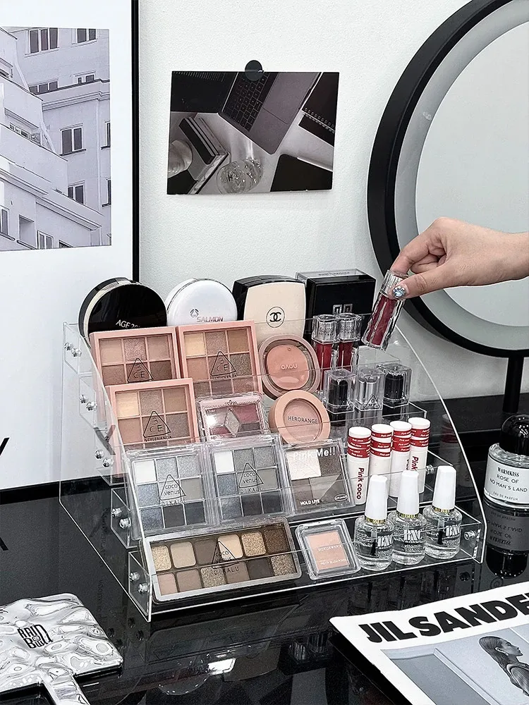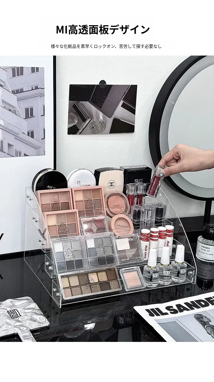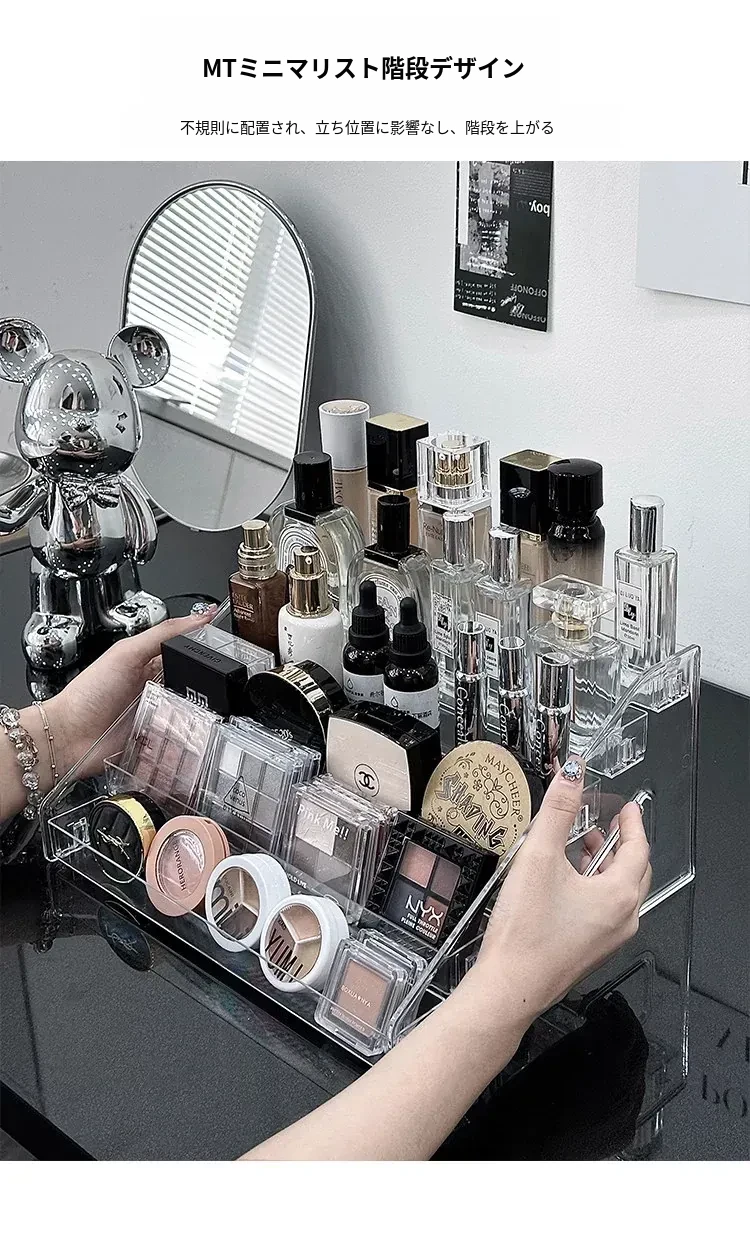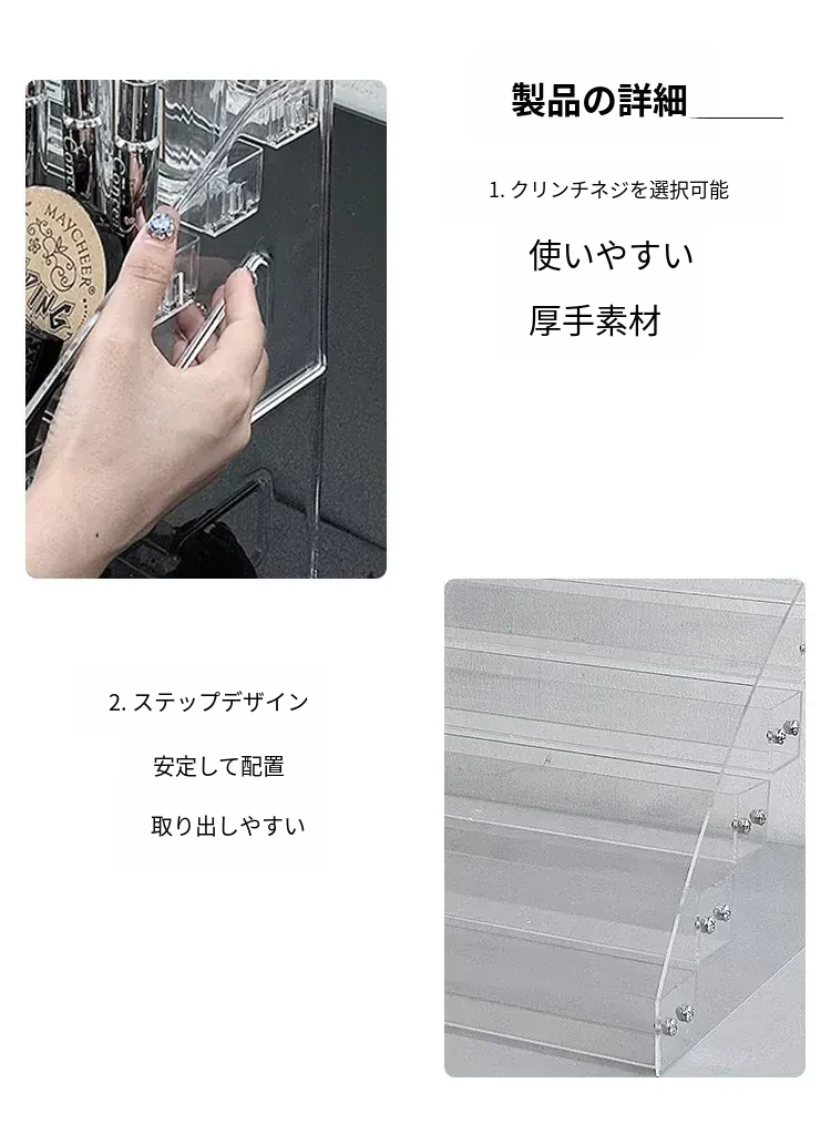 透明アクリル化粧品収納ボックス - デスクトップ用のスタイリッシュなメイク台、リップスティックやアイシャドウパレットを美しくディスプレイできる階段型収納ラック!お部屋をスッキリ整理して、おしゃれなメイク環境を手に入れましょう!
