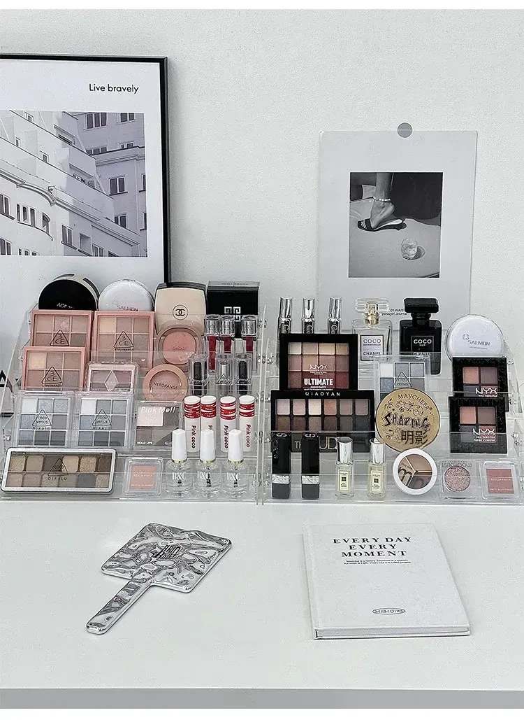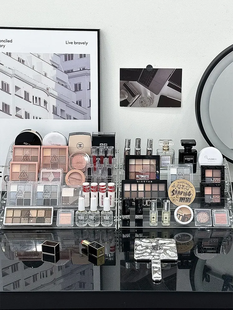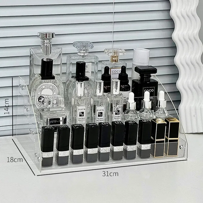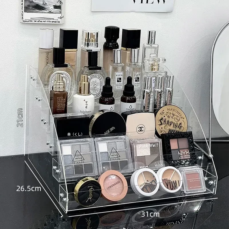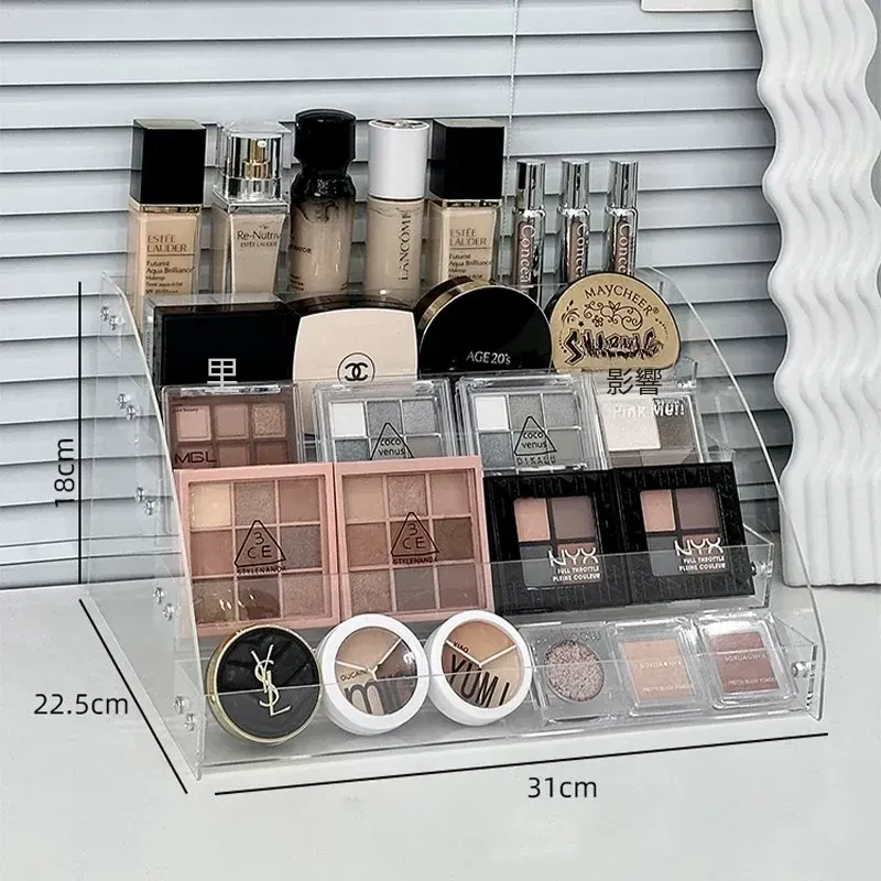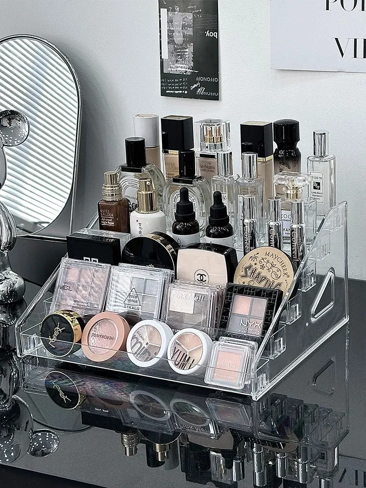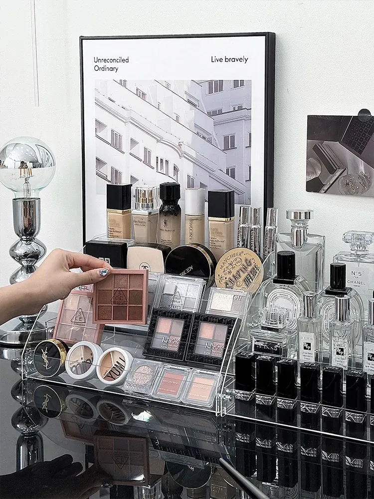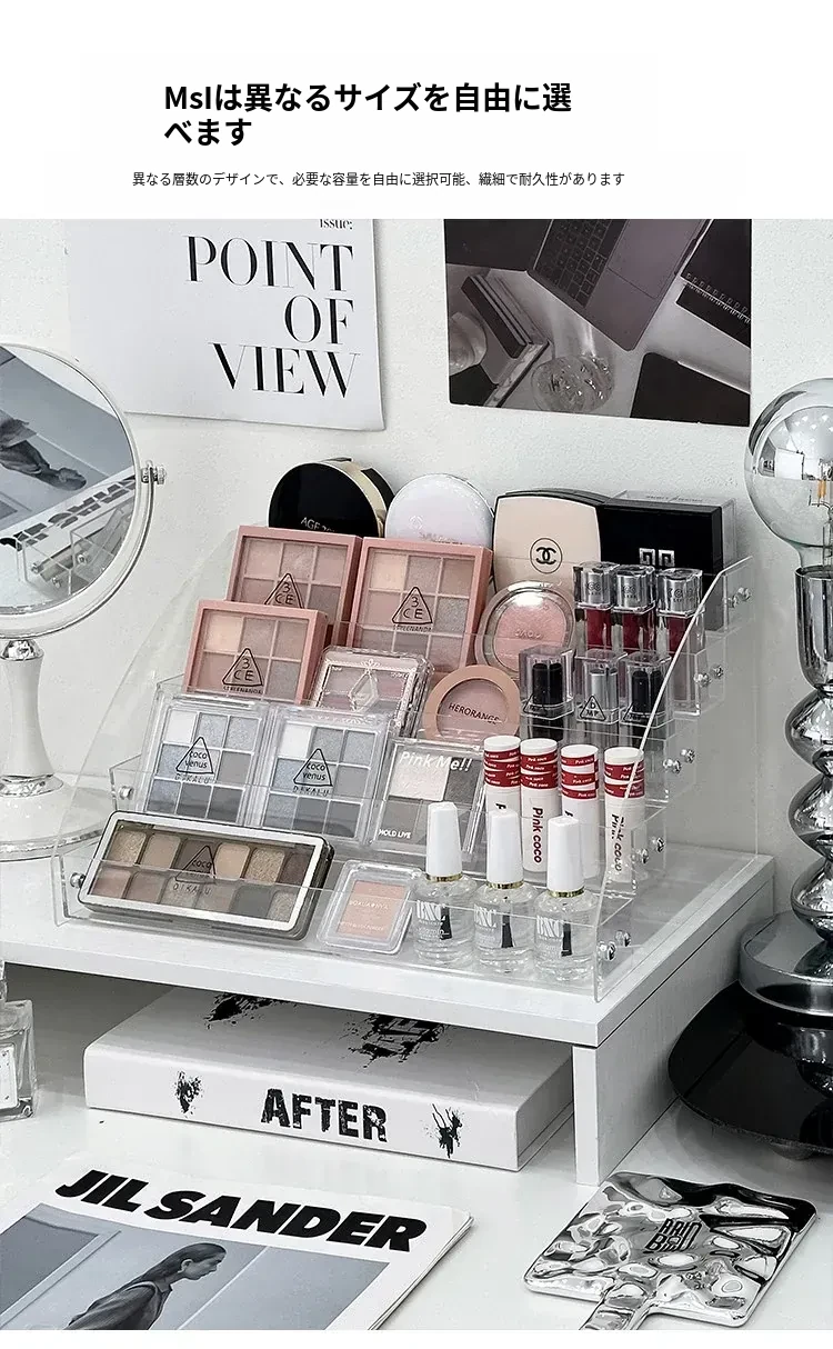 透明アクリル化粧品収納ボックス - デスクトップ用のスタイリッシュなメイク台、リップスティックやアイシャドウパレットを美しくディスプレイできる階段型収納ラック!お部屋をスッキリ整理して、おしゃれなメイク環境を手に入れましょう!