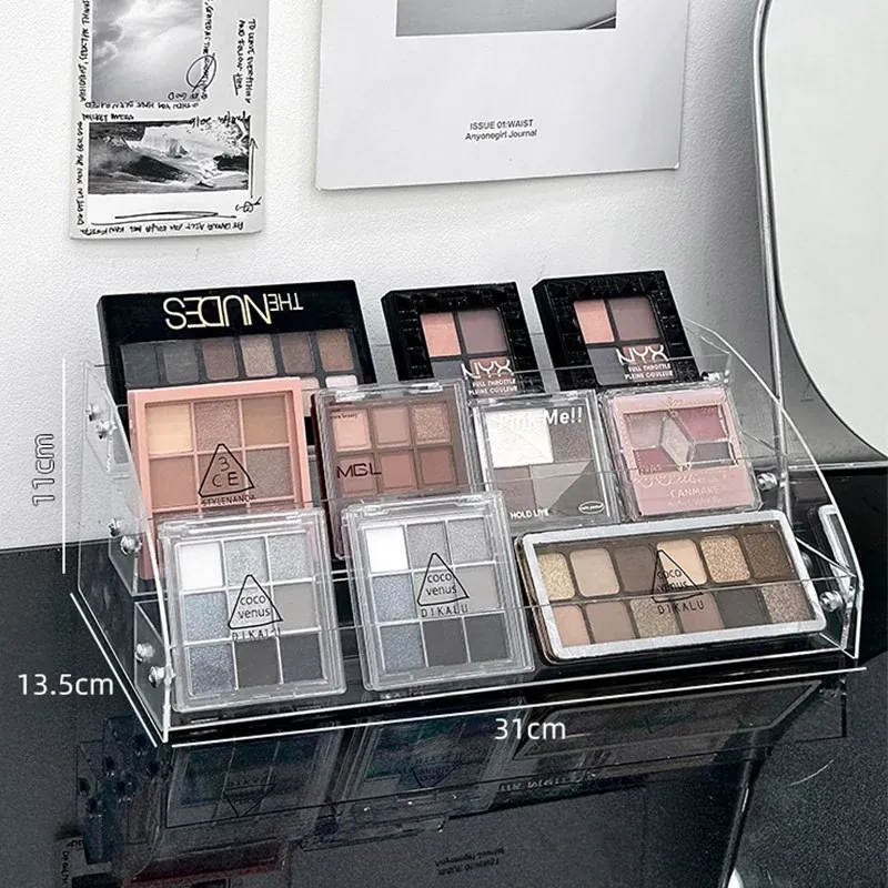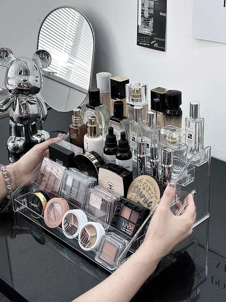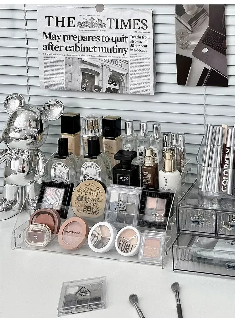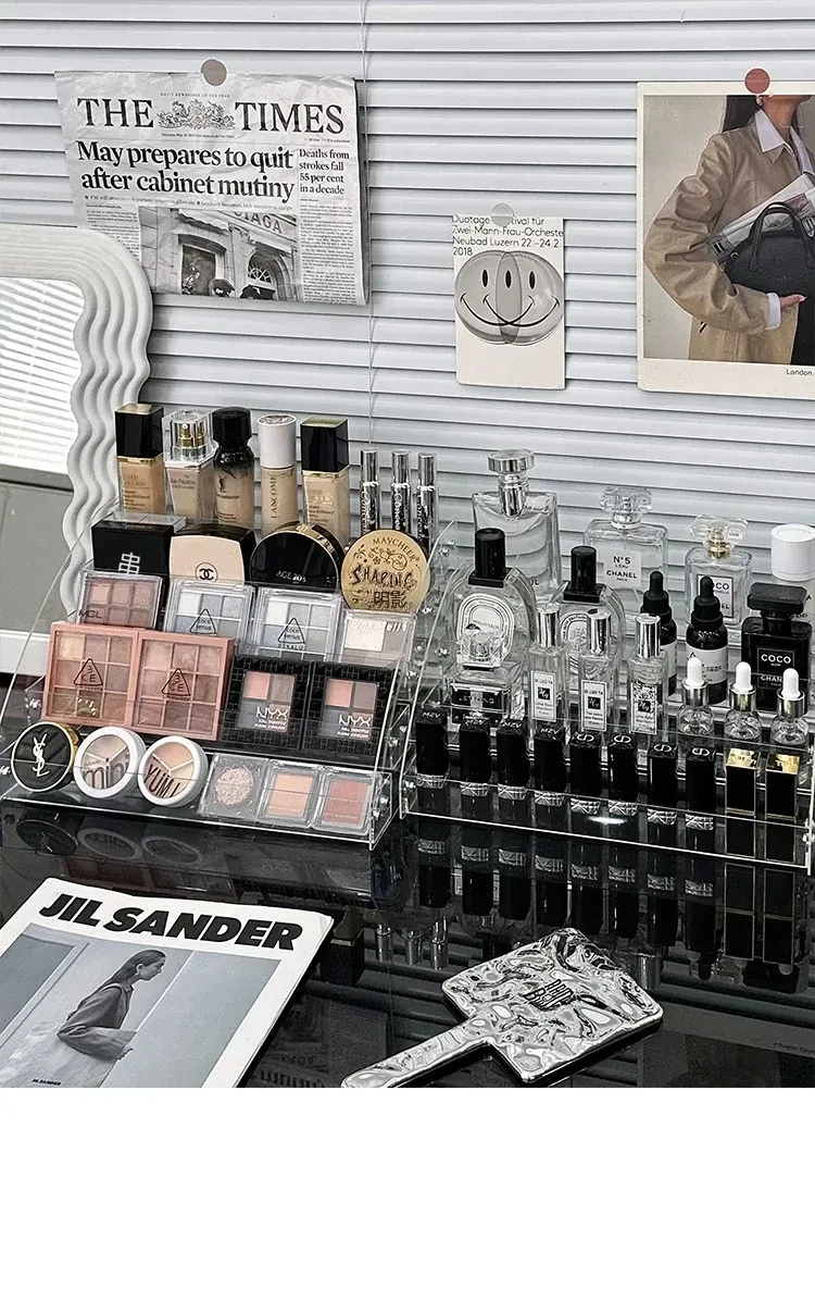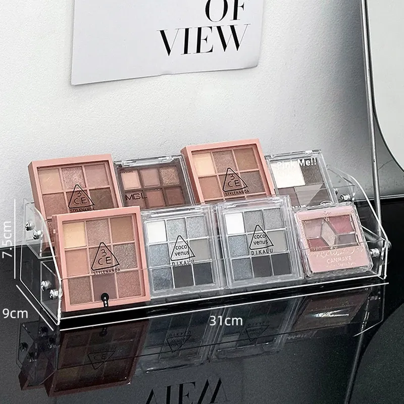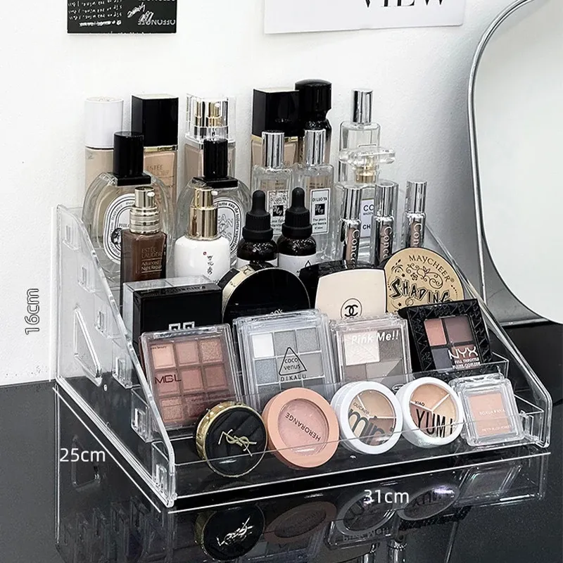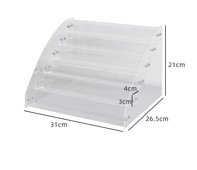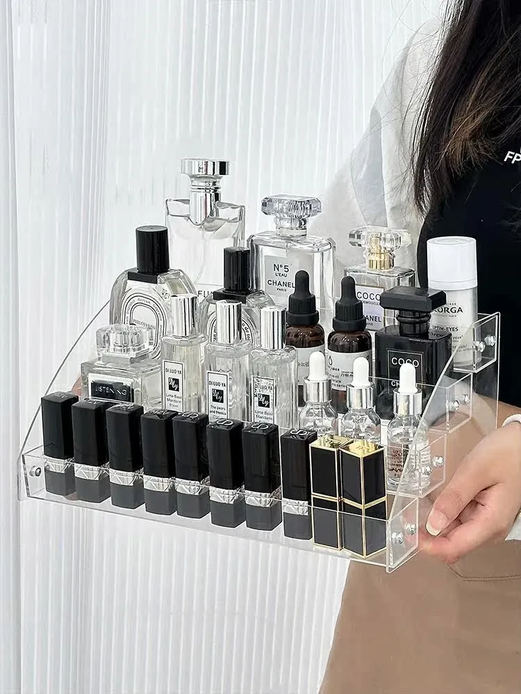 透明アクリル化粧品収納ボックス - デスクトップ用のスタイリッシュなメイク台、リップスティックやアイシャドウパレットを美しくディスプレイできる階段型収納ラック!お部屋をスッキリ整理して、おしゃれなメイク環境を手に入れましょう!