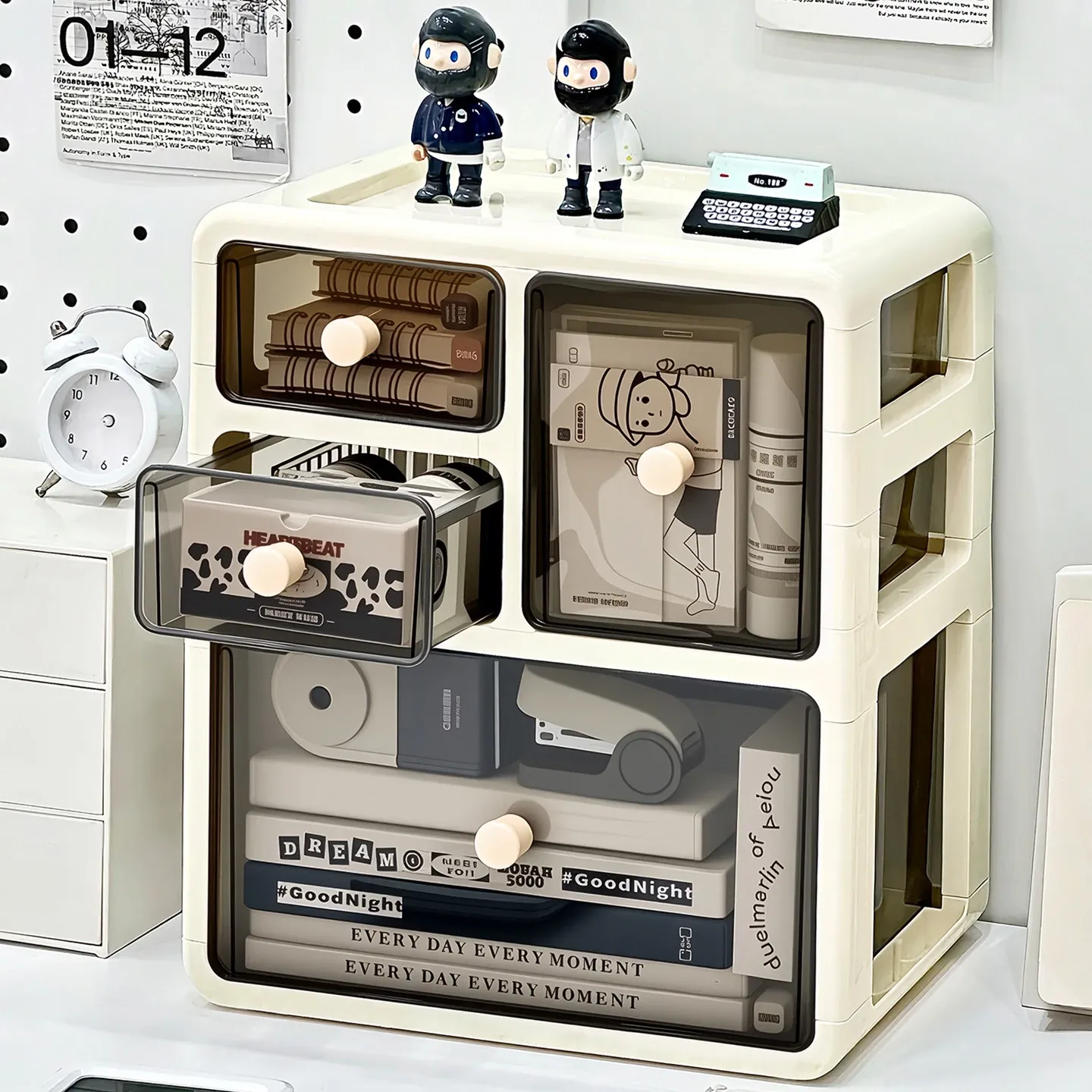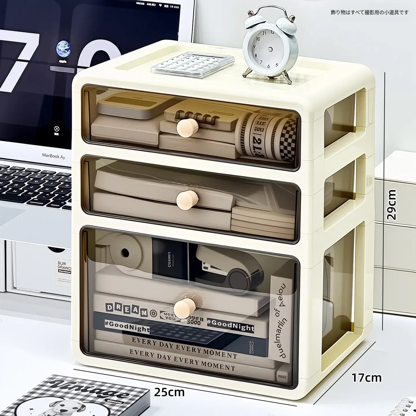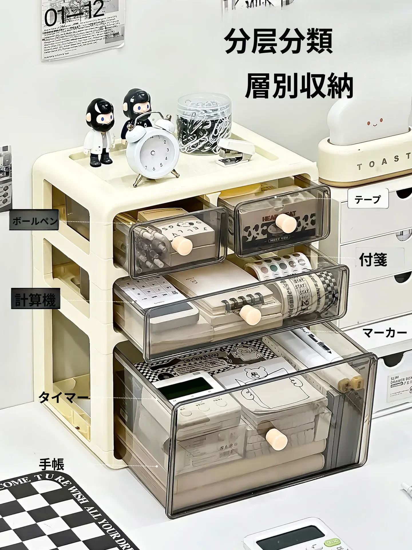 デスク用文房具収納ボックス - 透明で埃を防ぎ、学生の本や文具をすっきり整理!引き出し式デザインで使い勝手抜群の収納ラック。あなたの作業スペースを美しく整えましょう!