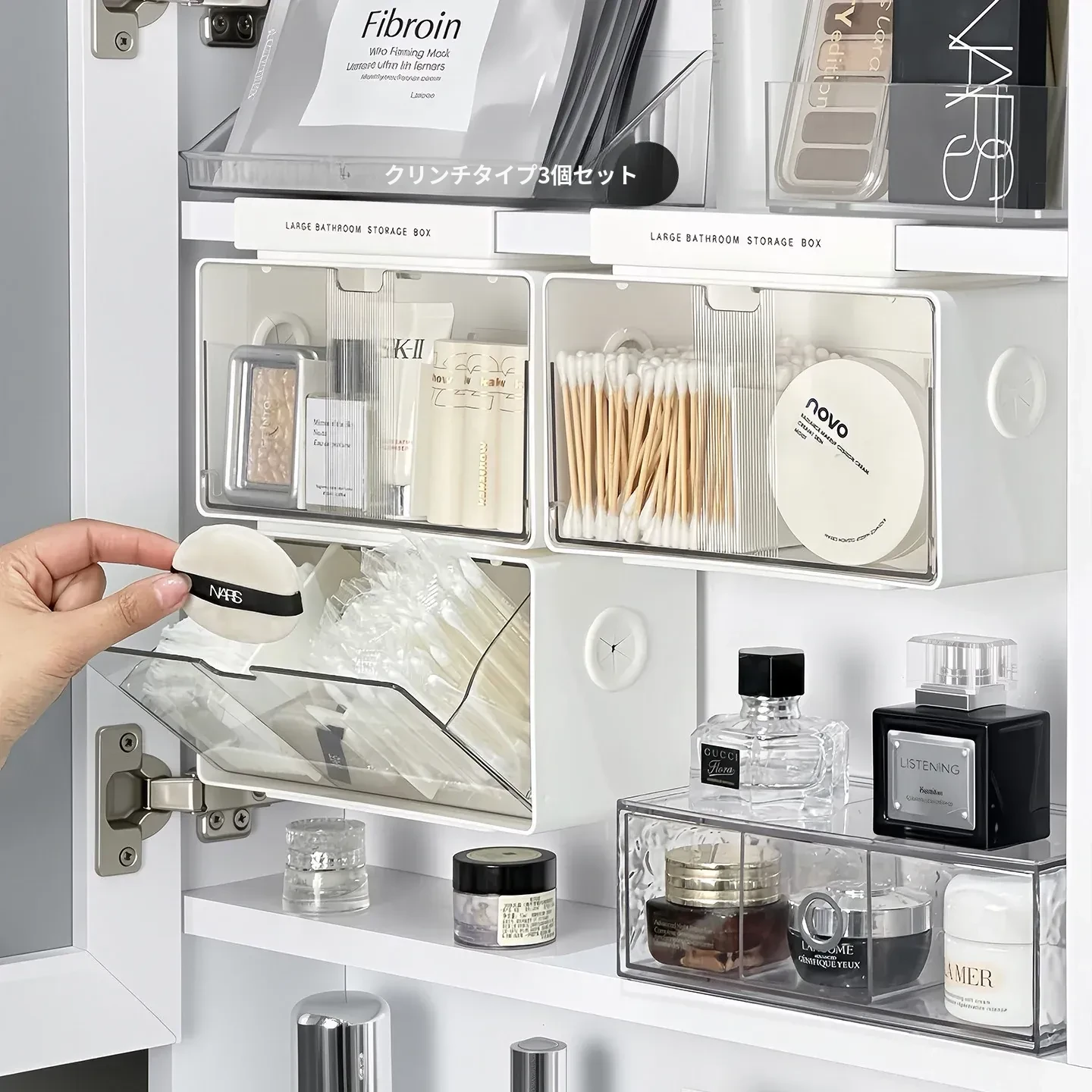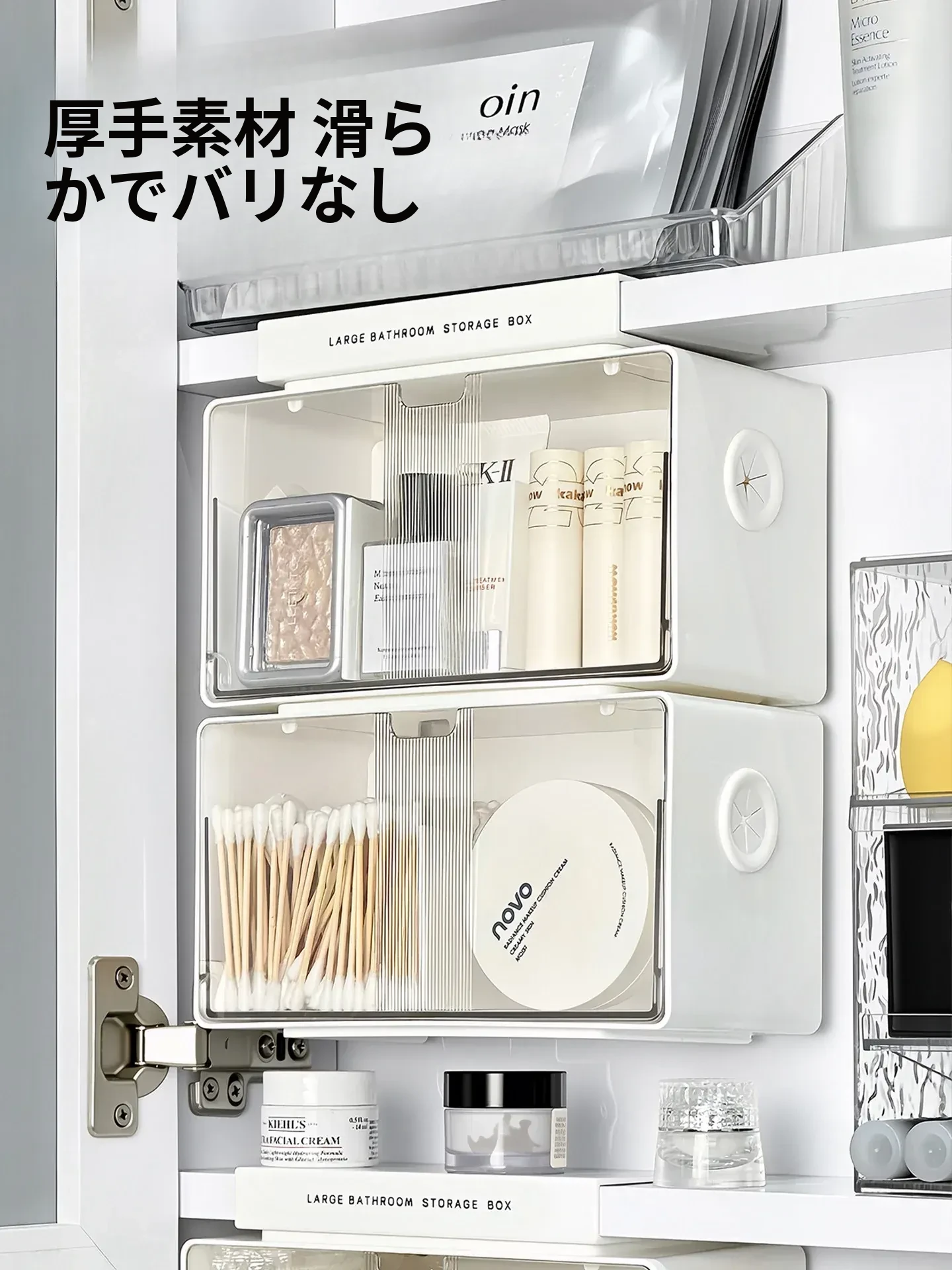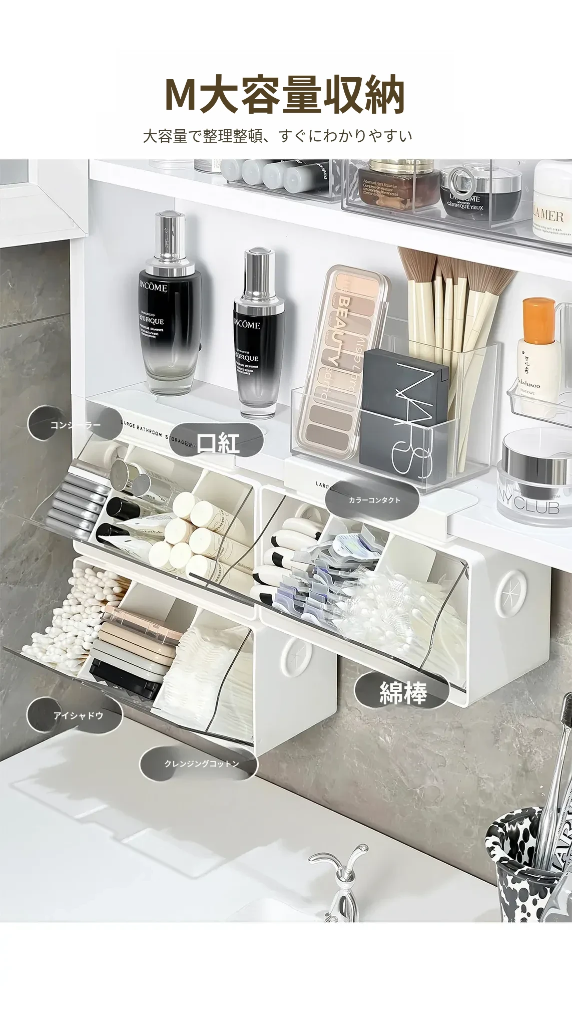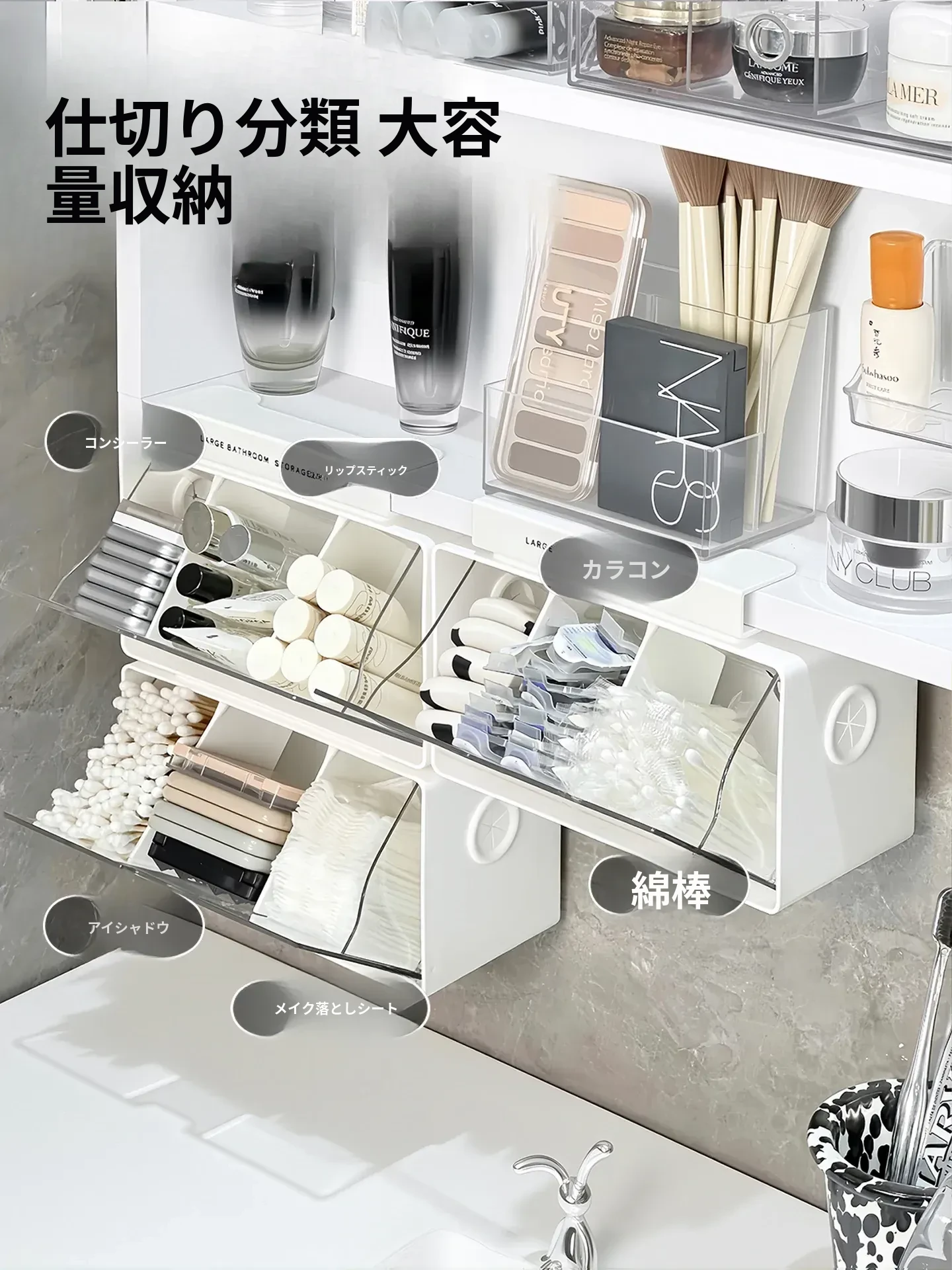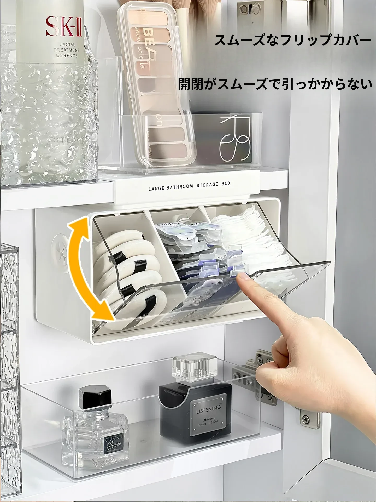 鏡の中のスキンケア収納ボックス|洗面所用化粧品整理|メイク落としコットン&綿棒用透明収納ラック|すっきり整理できる便利アイテム!