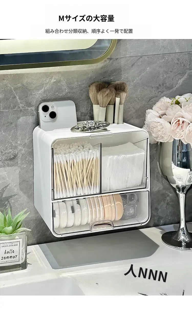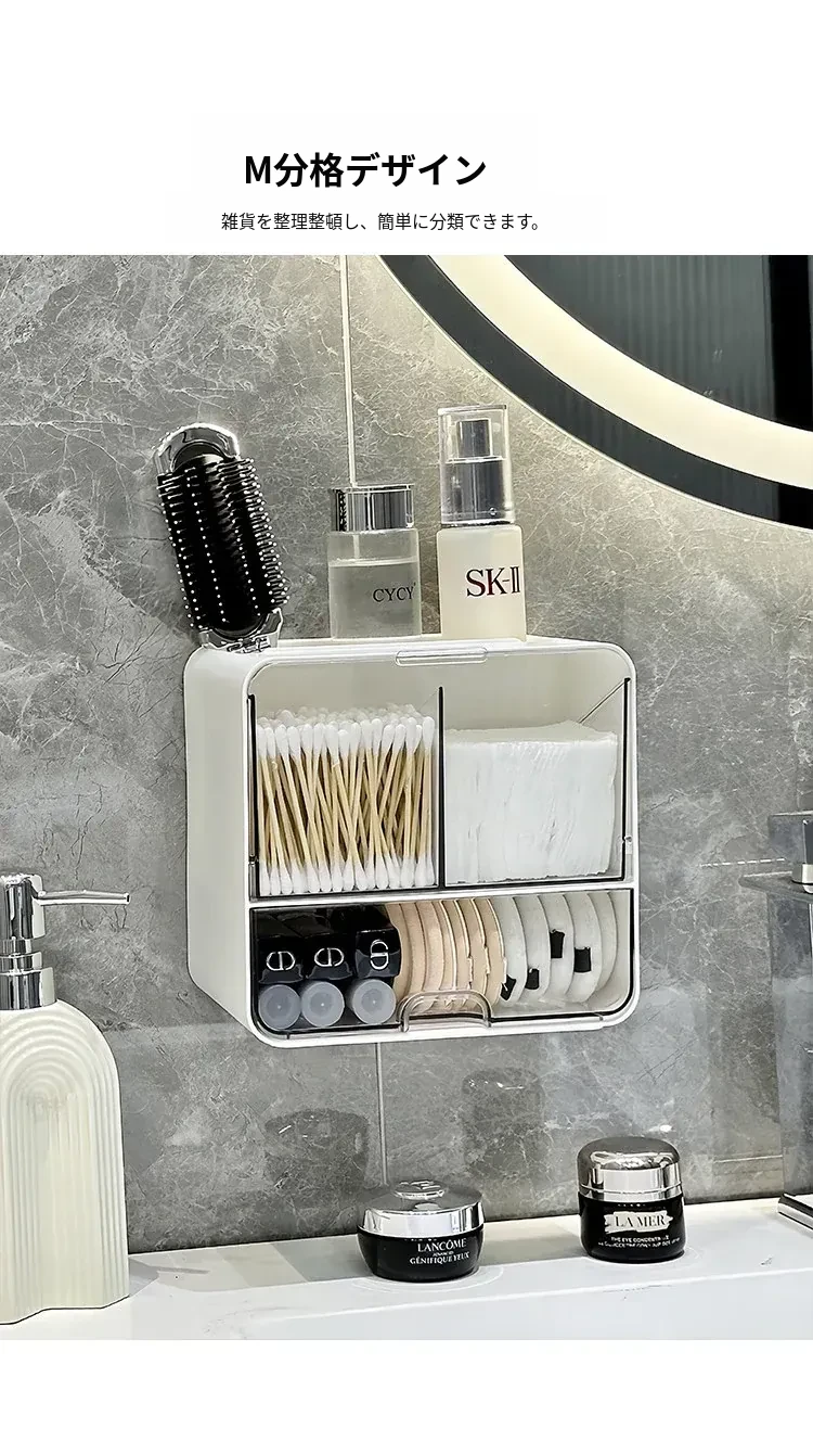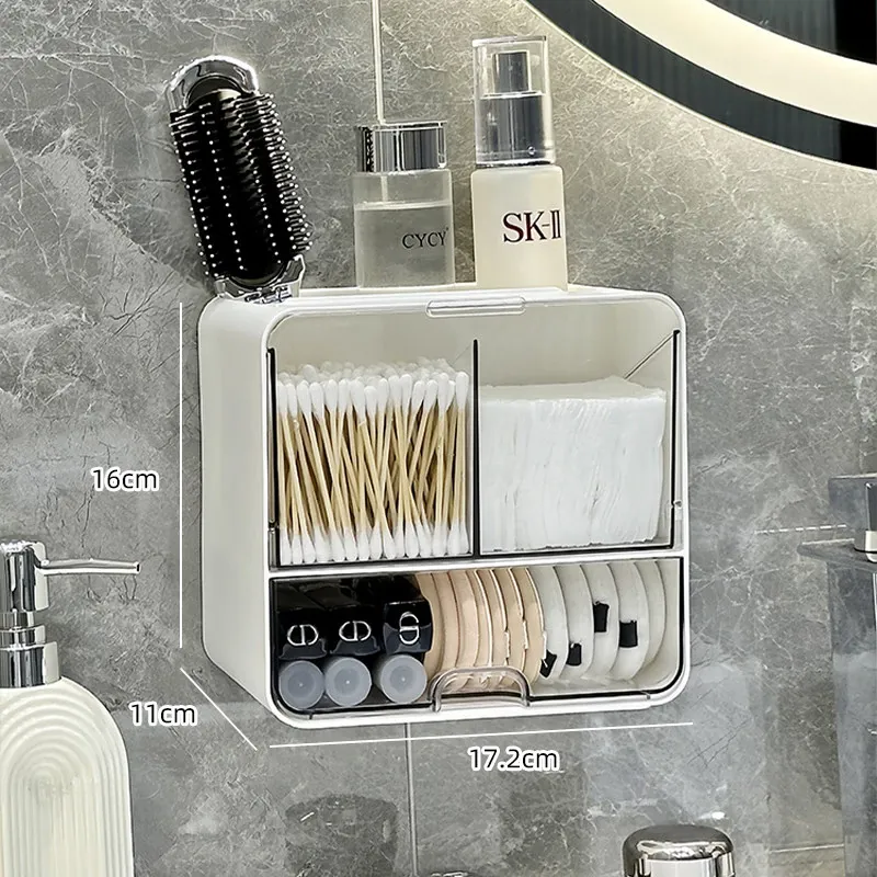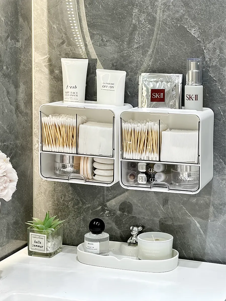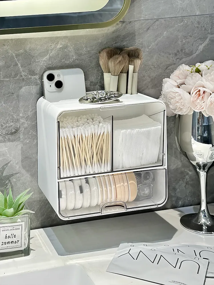 美しく整理整頓!壁掛け式コットン・メイクブラシ収納ボックス - トイレや鏡の下にぴったり!メイクパフやリップスティックもすっきり収納できる、スペースを有効活用するアイテムです。