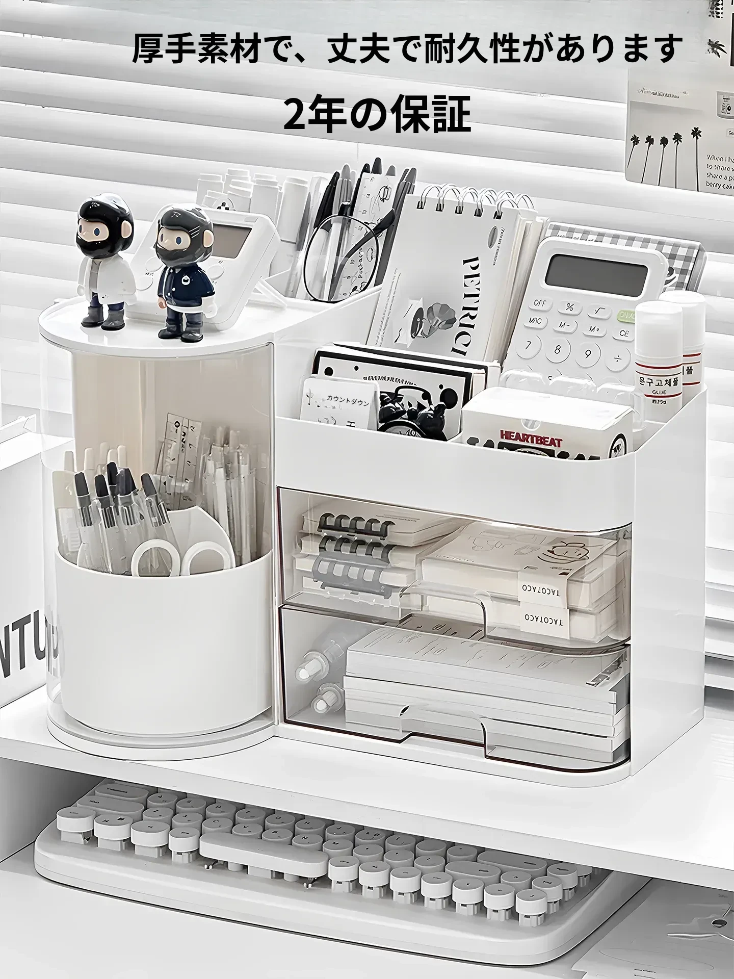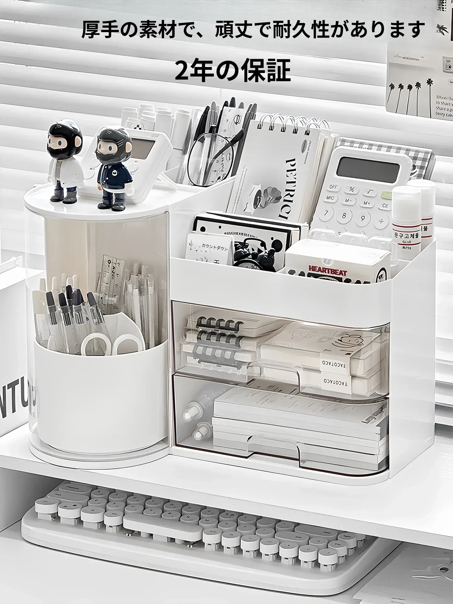 大容量アクリルデスク収納ボックス!学生向けのオシャレな引き出し式文房具整理ケース、回転式ペンスタンドで机周りをスッキリ!